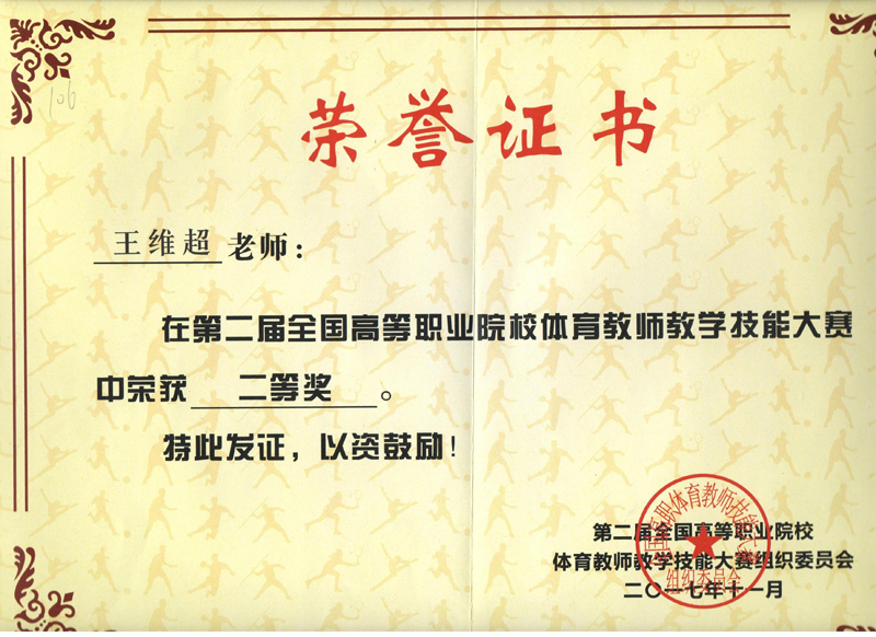 2017年11月27日至30日,人文藝術(shù)教育系王維超老師,代表我省參加了由教育部高等學(xué)校體育指導(dǎo)委員會在蘇州職業(yè)大學(xué)舉辦的,第二屆全國高等職業(yè)院校體育教師技能大賽,經(jīng)過激烈角逐最終榮獲二等獎。