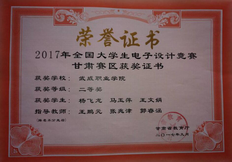 近日,2017年全國大學(xué)生電子設(shè)計(jì)競(jìng)賽甘肅賽區(qū)成績(jī)揭曉。由電子信息工程系2016級(jí)應(yīng)用電子技術(shù)專業(yè)楊飛龍、馬玉萍、王文娟3名同學(xué)組成的團(tuán)隊(duì)在我系王鵬元、張兆津、郭睿涵3名教師指導(dǎo)下榮獲甘肅賽區(qū)二等獎(jiǎng)。此次獲獎(jiǎng)也是我系在優(yōu)質(zhì)校建設(shè)中狠抓教學(xué)科研和學(xué)生技能培養(yǎng)方面取得的豐碩成果。