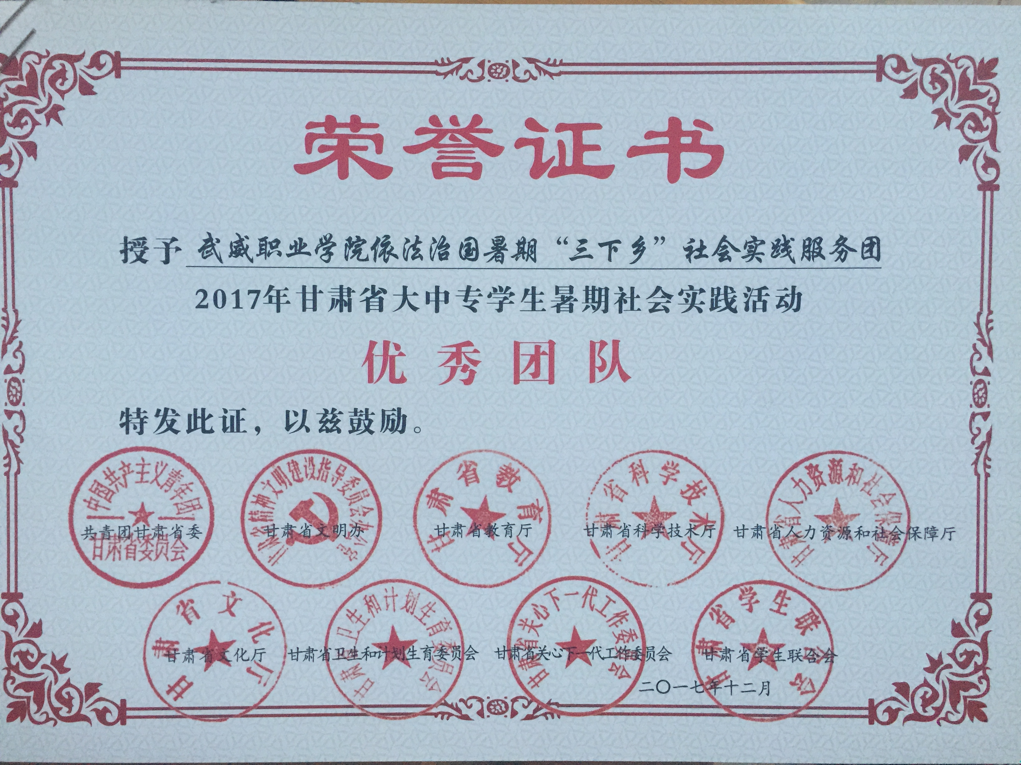 2017年甘肅省大中專學(xué)生暑期社會(huì)實(shí)踐活動(dòng)“優(yōu)秀團(tuán)隊(duì)”--依法治國(guó)暑期“三下鄉(xiāng)”社會(huì)實(shí)踐服務(wù)團(tuán)