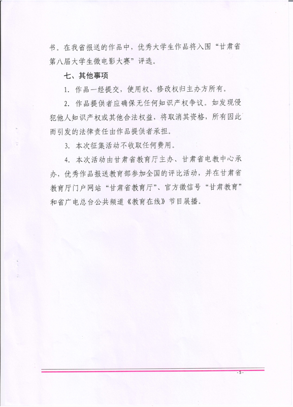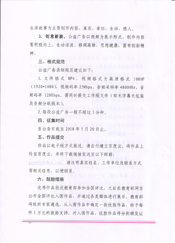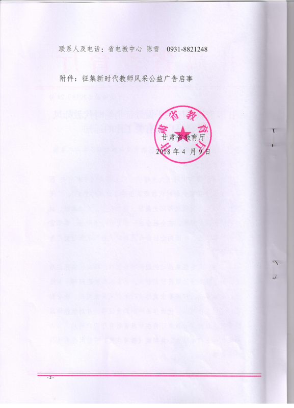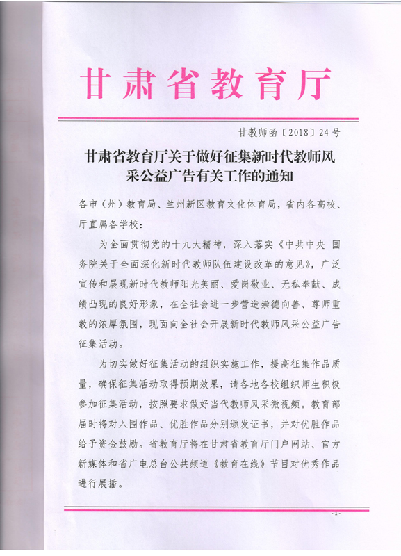 ???? 現(xiàn)將甘肅省教育廳《甘肅省教育廳關(guān)于做好征集新時(shí)代教師風(fēng)采公益廣告有關(guān)工作的通知》(甘教師函〔2018〕24號)轉(zhuǎn)發(fā)你們,請各部門、單位根據(jù)通知要求認(rèn)真組織,積極參與。將參賽作品于5月15日前報(bào)宣傳統(tǒng)戰(zhàn)部辦公室,宣傳統(tǒng)戰(zhàn)部對報(bào)送作品匯總后統(tǒng)一報(bào)送省教育廳電教中心。