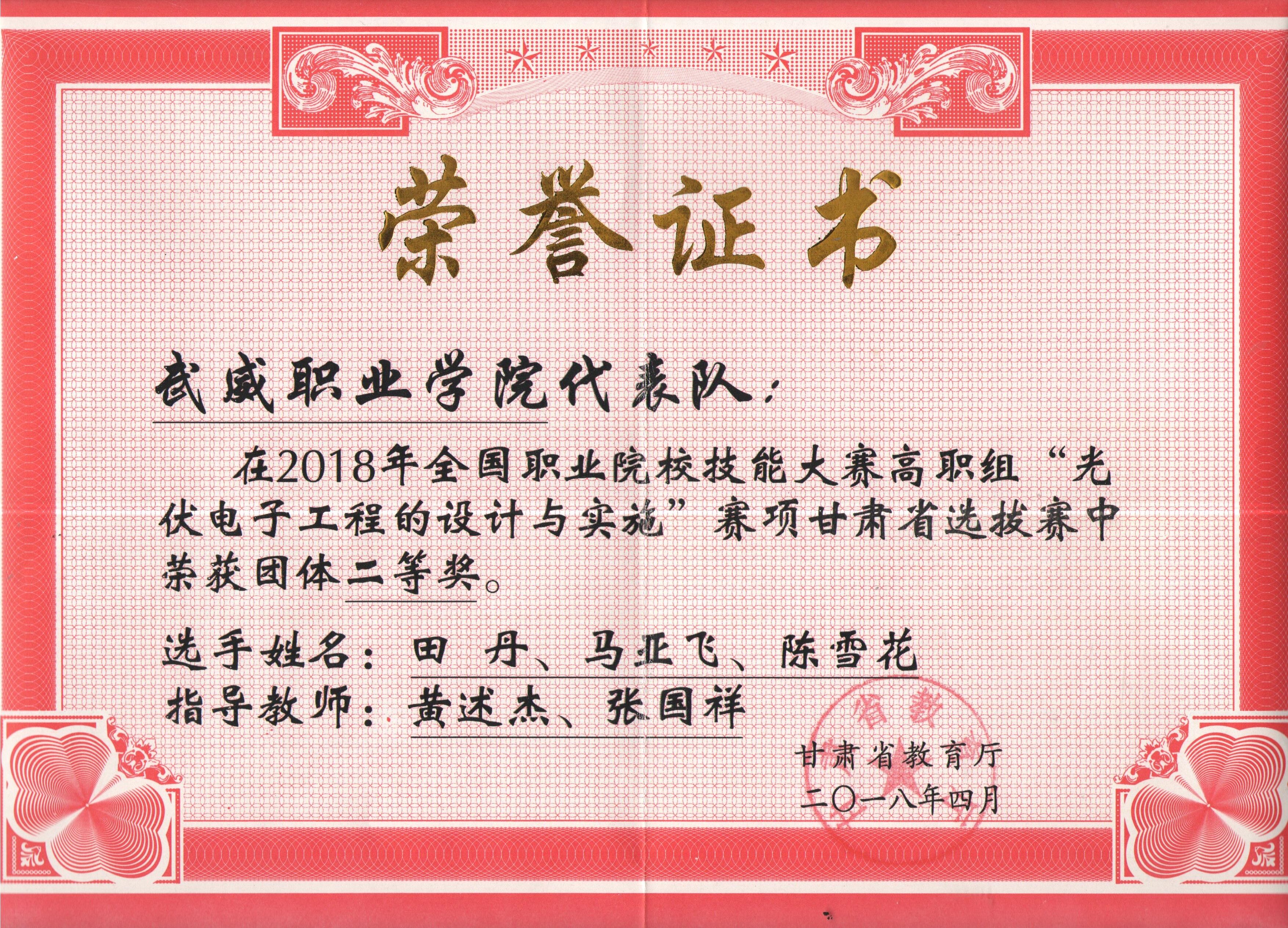 4月14日,2018年全國職業(yè)院校技能大賽“光伏電子工程的設(shè)計與實施”賽項甘肅省選拔賽在甘肅林業(yè)職業(yè)技術(shù)學(xué)院舉行。此次大賽有蘭州石化職業(yè)技術(shù)學(xué)院、甘肅林業(yè)職業(yè)技術(shù)學(xué)院、武威職業(yè)學(xué)院等6所院校的11支代表隊33名選手參加。由我院能源工程系黃述杰、張國祥老師指導(dǎo),田丹、馬亞飛、陳雪花三名學(xué)生組成的武威職業(yè)學(xué)院一隊榮獲二等獎。