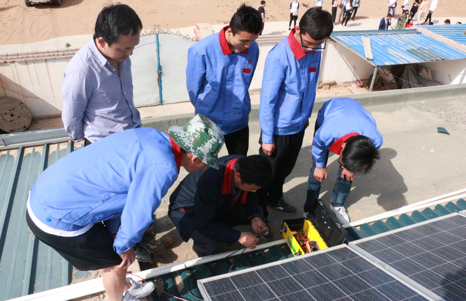 ? ? ?走進(jìn)圓夢(mèng)新村,由學(xué)院校辦企業(yè)武威泰豐新能源有限公司建設(shè)的200戶貧困家庭戶均3kw的分布式光伏發(fā)電系統(tǒng)映入眼簾。在社區(qū)書記郭林春的帶領(lǐng)下,黨員教師和學(xué)生入黨積極分子上門幫助用戶檢查維修光伏發(fā)電設(shè)備,檢查光伏組件的老化跡象以及所有連接器是否連接緊密、有無(wú)腐蝕現(xiàn)象,檢查組件是否接地良好。了解農(nóng)戶的需求,為農(nóng)戶講解光伏設(shè)備后期維護(hù)、電費(fèi)結(jié)算方式以及國(guó)家扶貧惠民的政策等知識(shí),并對(duì)部分農(nóng)戶屋頂光伏組件故障進(jìn)行了排除,對(duì)光伏組件進(jìn)行了大面積清潔維護(hù)。
