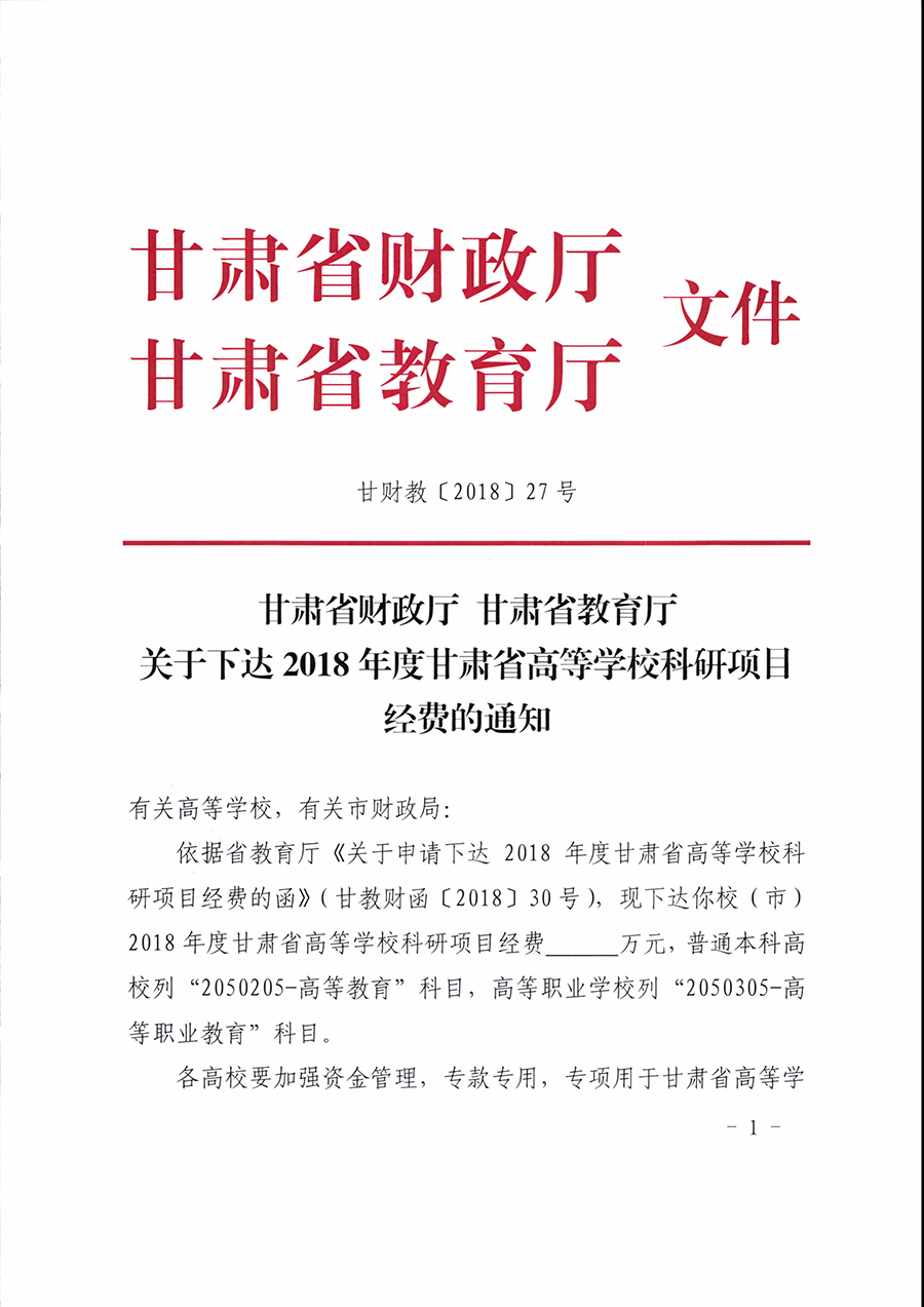轉(zhuǎn)發(fā)甘肅省財政廳 甘肅省教育廳關(guān)于下達2018年度甘肅省高等學(xué)??蒲许椖拷?jīng)費的通知