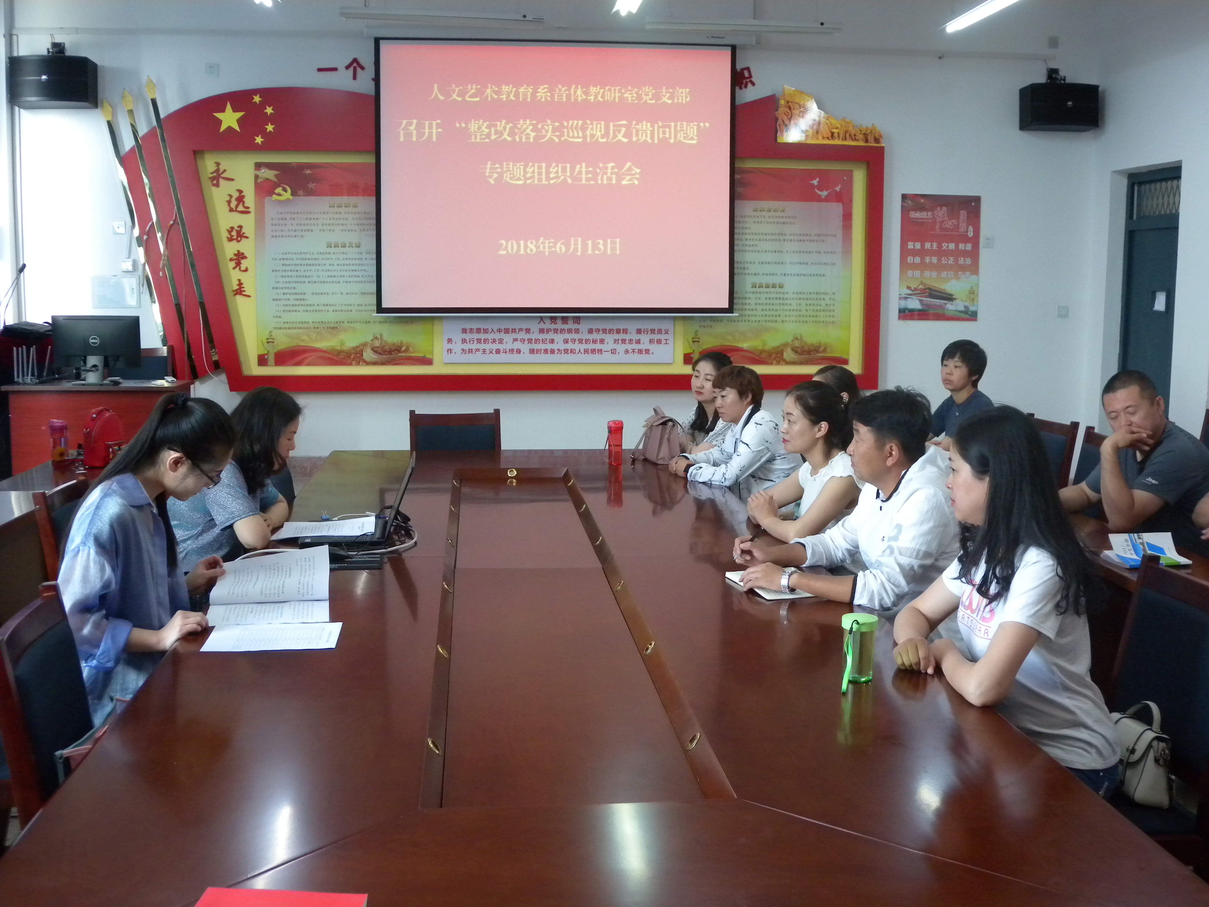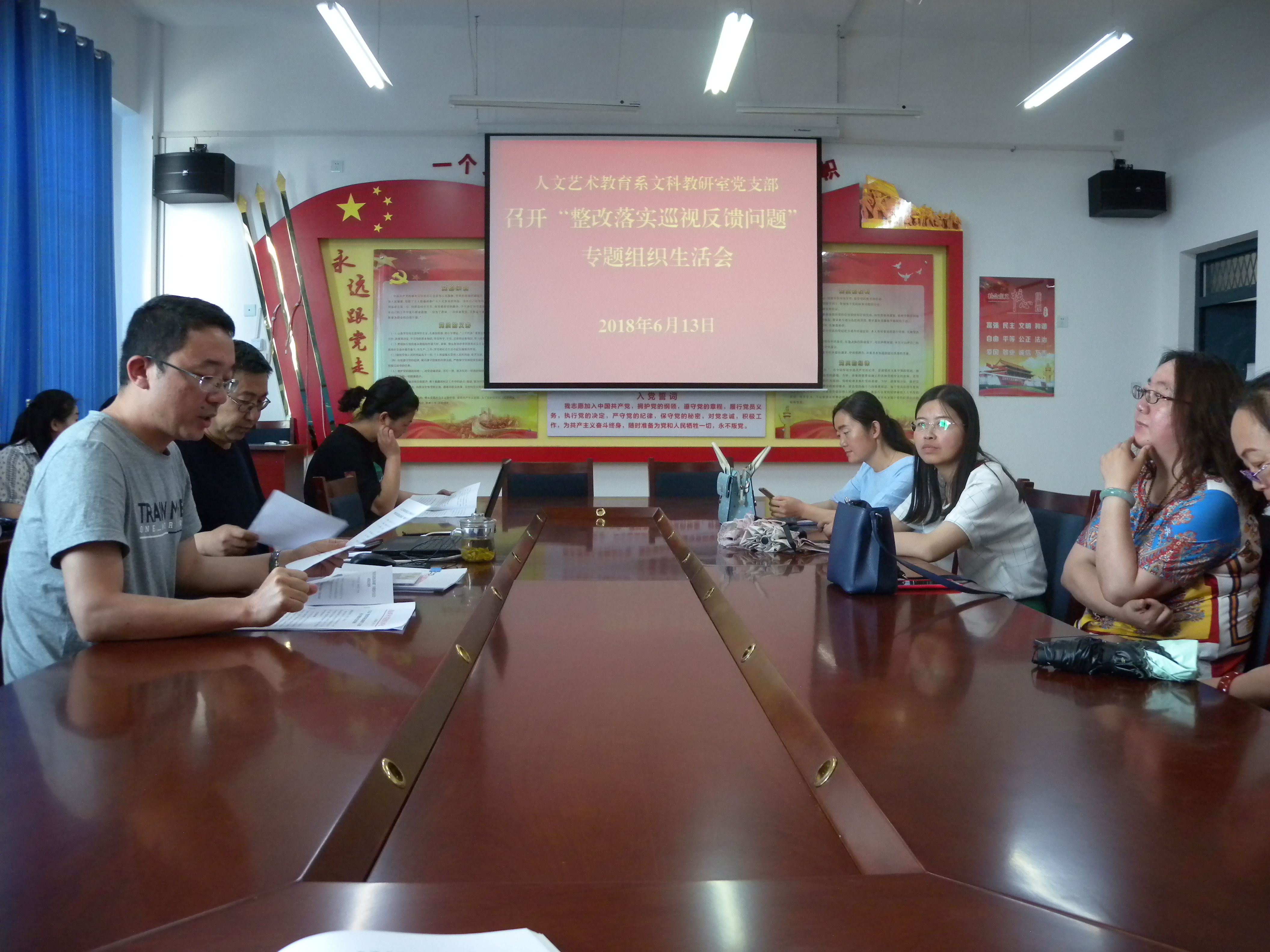 根據(jù)學院《關(guān)于以“整改落實巡視反饋問題”為主題召開專題組織生活會的通知》(武職院組函〔2018〕35號)精神,6月13日,人文藝術(shù)教育系黨總支文科教研室黨支部和音體教研室黨支部在勵勤樓209黨員活動室分別召開了以“整改落實巡視反饋問題”為主題的組織生活會。會議分別由支部書記主持,黨支部全體黨員參加。