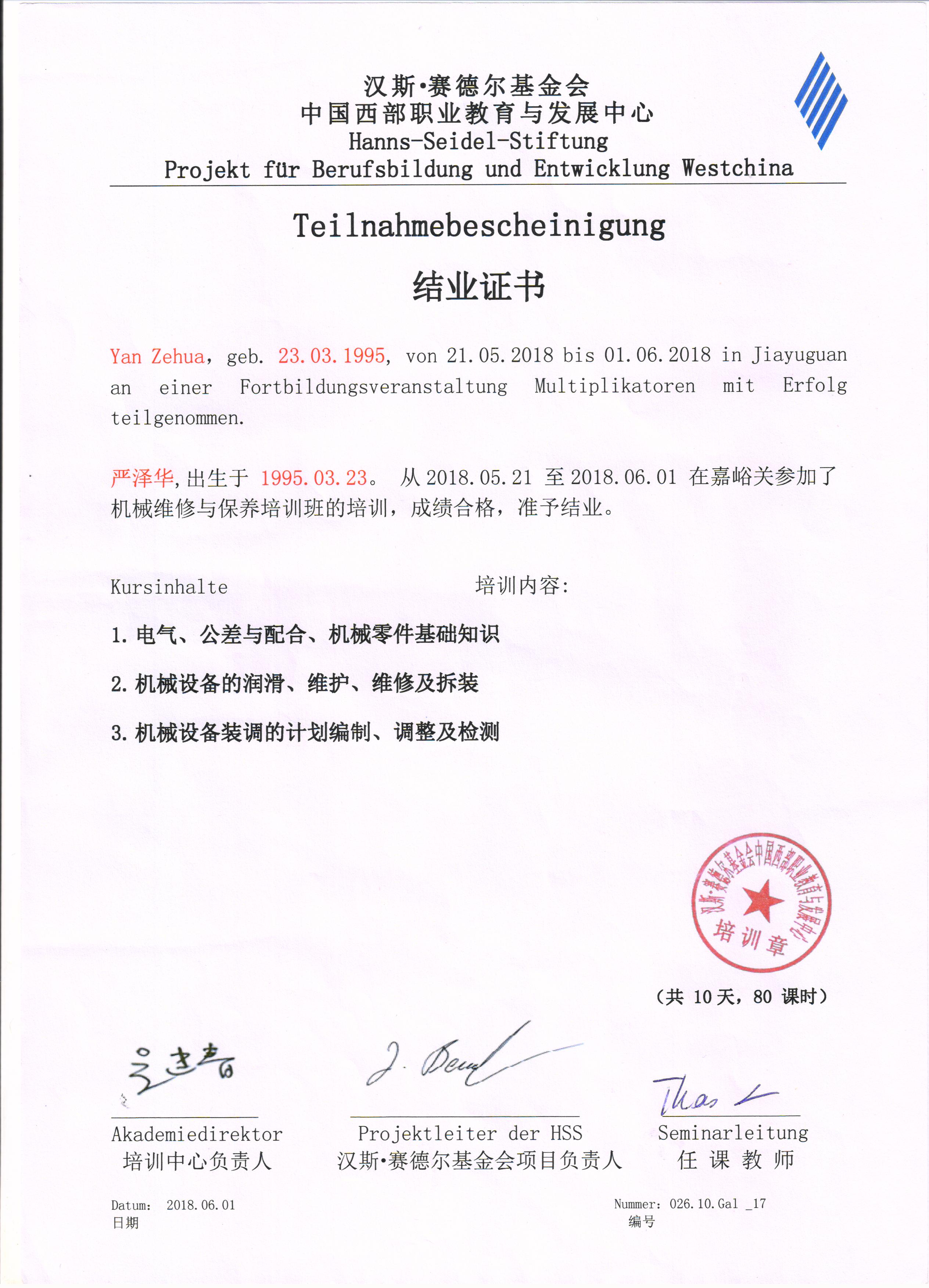 培訓(xùn)證書--參加漢斯·賽德?tīng)柣饡?huì)中國(guó)西部職業(yè)教育與發(fā)展中心培訓(xùn)
