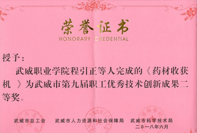 近日,武威市總工會(huì)、武威市人力資源和社會(huì)保障局、武威市科學(xué)技術(shù)局在全市企事業(yè)單位和廣大職工中廣泛開展了征集評(píng)選職工優(yōu)秀技術(shù)創(chuàng)新成果活動(dòng)。經(jīng)過(guò)逐級(jí)推薦、專家評(píng)審、網(wǎng)絡(luò)公示等程序,我系教師程引正等完成的《藥材收獲機(jī)》喜獲武威市第九屆職工優(yōu)秀技術(shù)創(chuàng)新成果二等獎(jiǎng)。