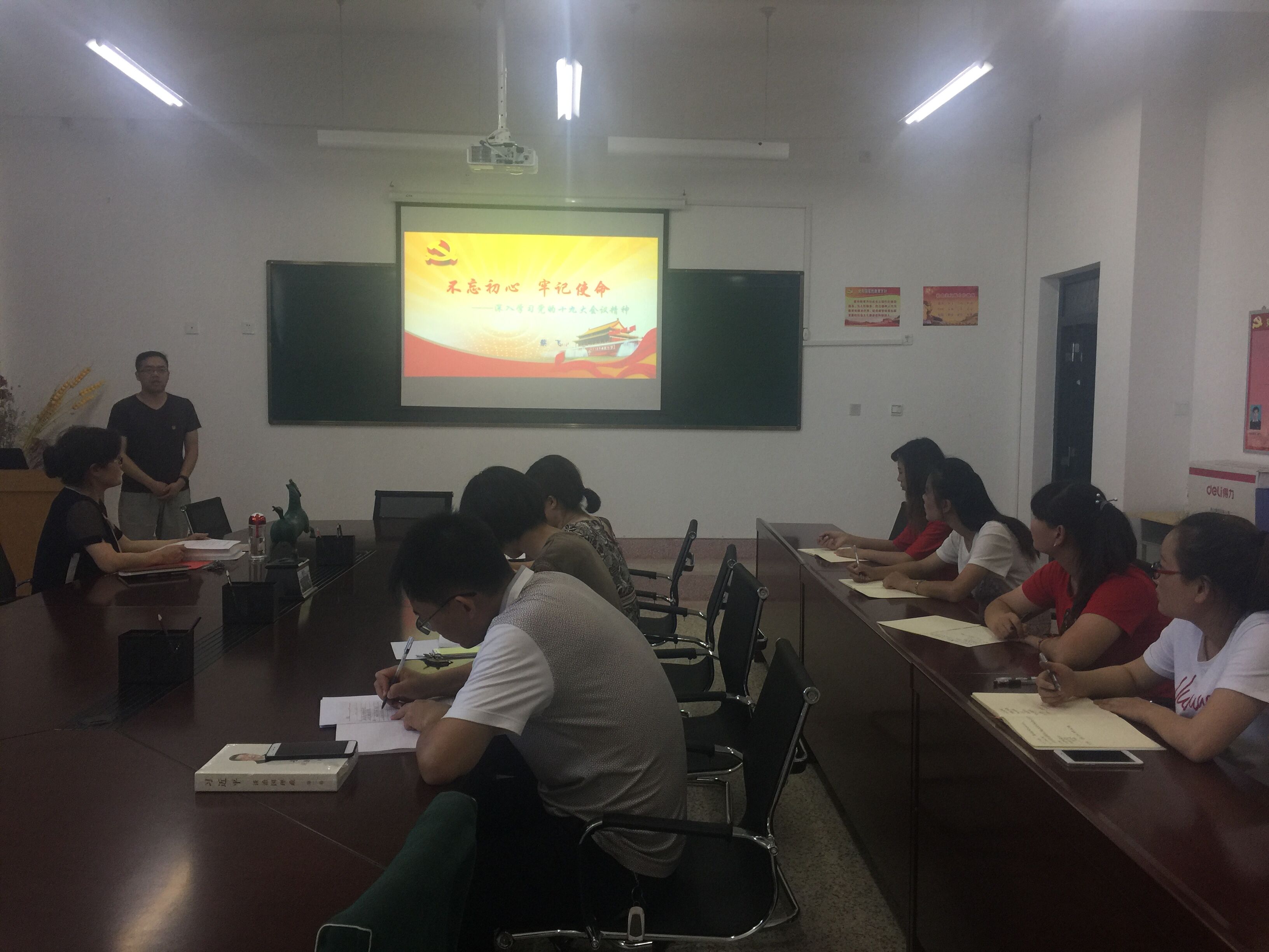 食品專業(yè)黨支部書記蔡飛同志講了題為 “不忘初心 牢記使命——深入學習黨的十九大會議精神”的黨課。他主要通過十九大會議的基本情況、重要意義和主題;十九大報告的主要內容;十九大報告的重要論斷和亮點,帶領全系黨員再一次深入學習了十九大精神。