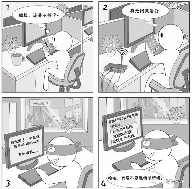 無(wú)線路由器有較多的安全隱患,比如之前的wep認(rèn)證能很輕易破解。個(gè)人架設(shè)無(wú)線路由器,如果配置不當(dāng),家用最多導(dǎo)致蹭網(wǎng)或個(gè)人資料泄露,但在單位使用可能會(huì)導(dǎo)致內(nèi)網(wǎng)被入侵,單位機(jī)密、客戶資料泄密,后果不堪設(shè)想。