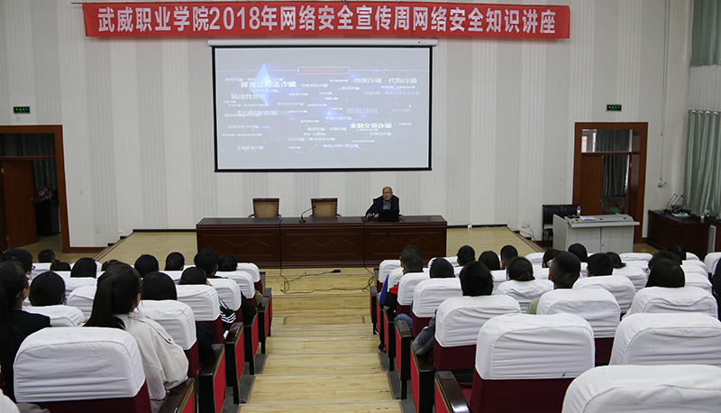為深入學(xué)習(xí)宣傳貫徹習(xí)近平總書記在全國網(wǎng)絡(luò)安全和信息化工作會議上“深入開展網(wǎng)絡(luò)安全知識技能宣傳普及,提高廣大人民群眾網(wǎng)絡(luò)安全意識和防護技能”的重要講話精神,按照甘肅省教育廳、武威市網(wǎng)信辦關(guān)于開展2018年國家網(wǎng)絡(luò)安全宣傳周活動的要求。9月18日下午,學(xué)院在正德廳舉辦了“網(wǎng)絡(luò)安全與《網(wǎng)絡(luò)安全法》”的專題講座,師生代表200余人參加。