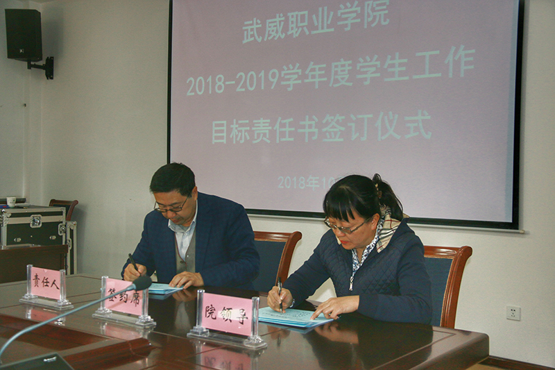 責(zé)任書簽訂儀式上,田迎春代表學(xué)院與各系黨總支書記或負責(zé)人簽訂了《武威職業(yè)學(xué)院2018-2019學(xué)年度學(xué)生工作目標責(zé)任書》。她充分肯定了各系2017-2018學(xué)年的學(xué)生工作,并就我院學(xué)生工作提出了具體要求,一是學(xué)生工作要緊緊圍繞“立德樹人”的根本任務(wù),樹立全院全員育人思想,各系要強化學(xué)生工作管理責(zé)任,增強工作主動性和責(zé)任性,使學(xué)生管理的各項工作更細、更實;二是各系要在學(xué)生思想政治教育和日常管理工作中堅持誰主管誰負責(zé)的原則,力求做到“工作規(guī)范化、管理精細化、服務(wù)人性化”;三是各系及學(xué)工部門在思想上要與學(xué)院保持高度一致,在工作落實上與學(xué)院保持相向而行,切實將目標責(zé)任書的承諾轉(zhuǎn)化為抓工作、謀發(fā)展、促改革的具體行動;四是要在就業(yè)創(chuàng)業(yè)上下功夫,促進畢業(yè)生就業(yè)率有所提高、就業(yè)質(zhì)量不斷上升;五是各系要繼續(xù)發(fā)揚勇于創(chuàng)新、開拓進取的精神,以更飽滿的熱情、更昂揚的斗志、更務(wù)實的作風(fēng)推進我院學(xué)生管理工作的科學(xué)發(fā)展。