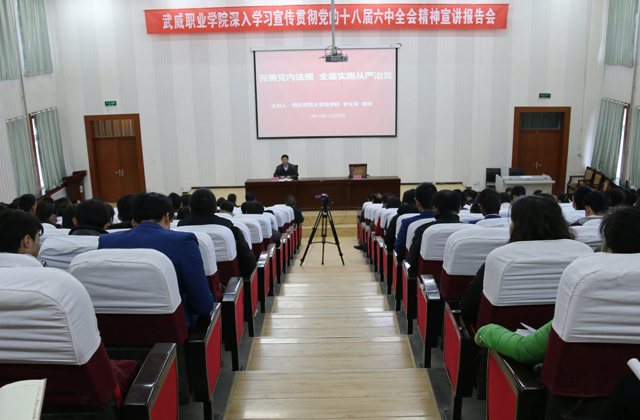 為全面準(zhǔn)確學(xué)習(xí)宣傳黨的十八屆六中全會(huì)精神,12月9日上午,學(xué)院在尚德樓正德廳舉辦“深入學(xué)習(xí)宣傳貫徹黨的十八屆六中全會(huì)精神宣講報(bào)告會(huì)”,邀請(qǐng)西北師范大學(xué)教授李玉璧作題為《完善黨內(nèi)法規(guī) 全面實(shí)施從嚴(yán)治黨》的宣講報(bào)告。學(xué)院副院長(zhǎng)王永緒、潘玉華、田迎春,中層干部及師生代表200余人參加報(bào)告會(huì)。田迎春主持宣講報(bào)告會(huì)。