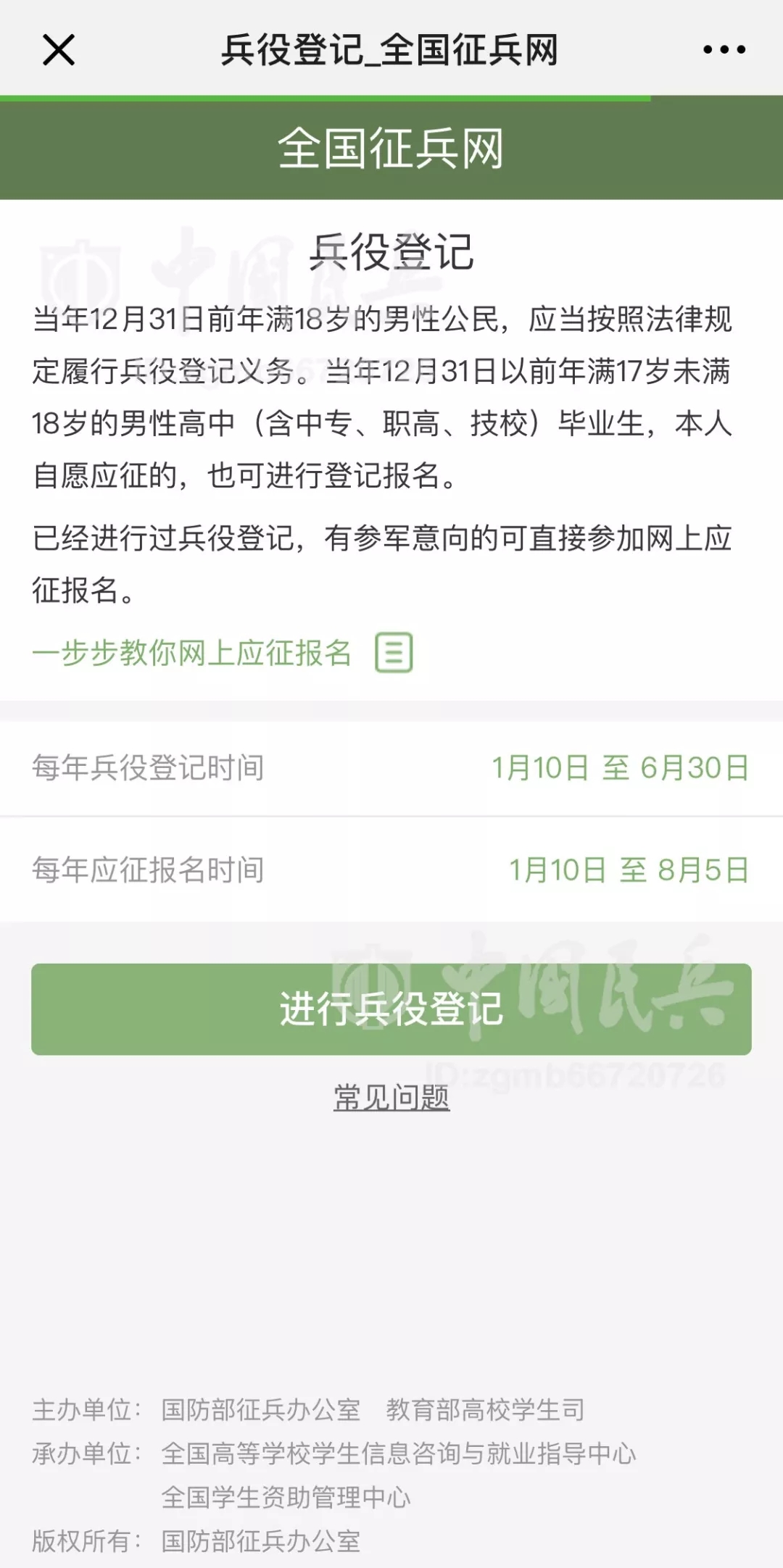 中國民兵北京1月9日電?張東華、記者劉國順報道:日前,國防部征兵辦公室下發(fā)《關(guān)于做好2019年征兵準備工作的通知》,對新年度征兵準備工作進行安排部署,要求各地深入貫徹習近平強軍思想,全面聚焦備戰(zhàn)打仗,統(tǒng)籌推進征兵組織建設、能力建設、法規(guī)建設、廉政建設,確保高質(zhì)量完成新年度征兵任務,并明確全國征兵網(wǎng)(網(wǎng)址:http://www.gfbzb.gov.cn),或關(guān)注“中國民兵”微信公眾號(ID:zgmb66720726)1月10日正式開通,受理網(wǎng)上兵役登記、應征報名和政策咨詢等工作事項。