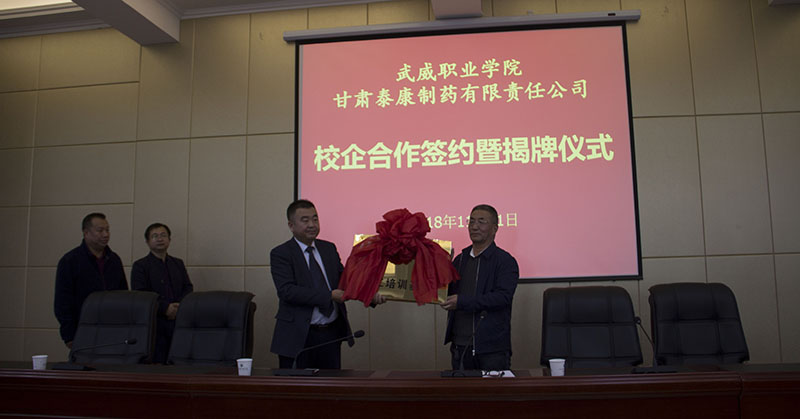 為提高人才培養(yǎng)質(zhì)量和辦學(xué)水平,加強(qiáng)校企協(xié)同育人機(jī)制建設(shè),2018年11月1日下午,藥學(xué)系與甘肅泰康制藥有限責(zé)任公司校企合作共建“就業(yè)實(shí)習(xí)基地”簽約揭牌儀式在行樹樓北側(cè)會(huì)議室隆重舉行。甘肅泰康制藥有限責(zé)任公司投資方—北京久朝集團(tuán)產(chǎn)業(yè)中心總監(jiān)楊宏超、公司總工程師毛著鴻、財(cái)務(wù)總監(jiān)郝敏等企業(yè)領(lǐng)導(dǎo)出席本次儀式。學(xué)院教務(wù)處處長(zhǎng)仲生仁、招生就業(yè)處處長(zhǎng)蔡柱山、藥學(xué)系主任魏潤(rùn)明、副主任楊建美、黨總支副書記單光年及藥學(xué)系160余名師生參加了此次簽約揭牌儀式。儀式由魏潤(rùn)明主持。