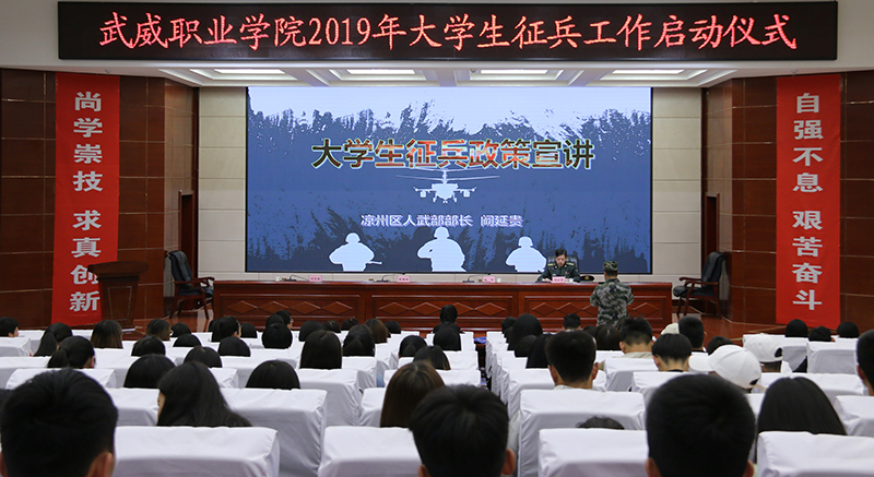 5月9日下午,學(xué)院2019年大學(xué)生征兵工作啟動(dòng)儀式在大學(xué)生活動(dòng)中心菁英廳舉行。武威軍分區(qū)司令員、市征兵領(lǐng)導(dǎo)小組副組長(zhǎng)張國輝大校,涼州區(qū)人武部部長(zhǎng)、涼州區(qū)征兵領(lǐng)導(dǎo)小組副組長(zhǎng)兼征兵辦公室主任闞延貴上校,學(xué)院黨委書記、院長(zhǎng)趙明,副院長(zhǎng)田迎春,武威軍分區(qū)動(dòng)員處、涼州區(qū)人武部干部,學(xué)院各系黨總支書記、輔導(dǎo)員及學(xué)生代表共計(jì)220余人參加了會(huì)議。會(huì)議由田迎春主持。