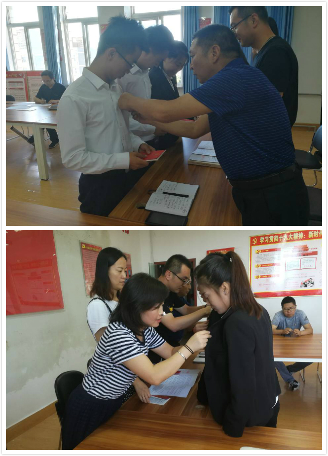 在唐宗舜同志的帶領(lǐng)下,4名預(yù)備黨員和全體黨員右手握拳舉過肩頭,面向鮮紅的黨旗,進(jìn)行了莊嚴(yán)宣誓。宣誓結(jié)束后,參加宣誓儀式的正式黨員為預(yù)備黨員佩戴了黨徽、贈(zèng)送了《黨章》。