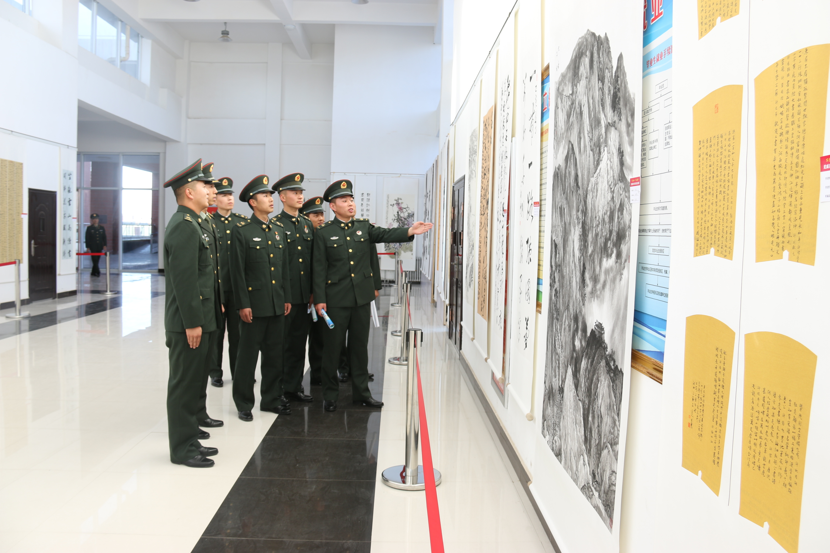 為進(jìn)一步加強(qiáng)師生愛國主義和國防教育,推進(jìn)學(xué)院“雙擁”工作,促進(jìn)文化交流,10月18日下午,武威某駐地部隊(duì)官兵到學(xué)院參觀 “不忘初心、牢記使命”武威美術(shù)書法作品交流展。學(xué)院黨委委員、副院長何毅,宣傳統(tǒng)戰(zhàn)部、新能源與動力工程學(xué)院辦公室負(fù)責(zé)同志,學(xué)院部分師生與部隊(duì)官兵一同觀看。