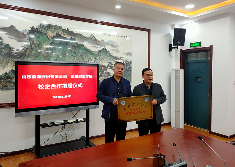 在捐贈儀式上,楊兆永總經(jīng)理介紹了山東藍(lán)海股份有限公司做了介紹,雙方在人才需求、專業(yè)課程設(shè)置開發(fā)、雙師型師資培養(yǎng)、教學(xué)組織實習(xí)質(zhì)量評估、就業(yè)服務(wù)等多方面合作近十年,已經(jīng)將校企雙方緊密聯(lián)合在一起,同時希望今后繼續(xù)不斷在師資隊伍培養(yǎng)、人才培養(yǎng)、教育教學(xué)繼續(xù)加強(qiáng)合作,實現(xiàn)雙贏,共同發(fā)展。
