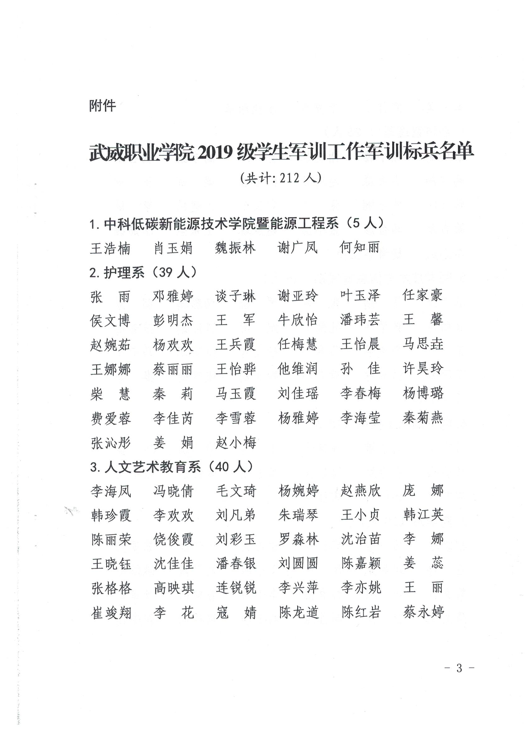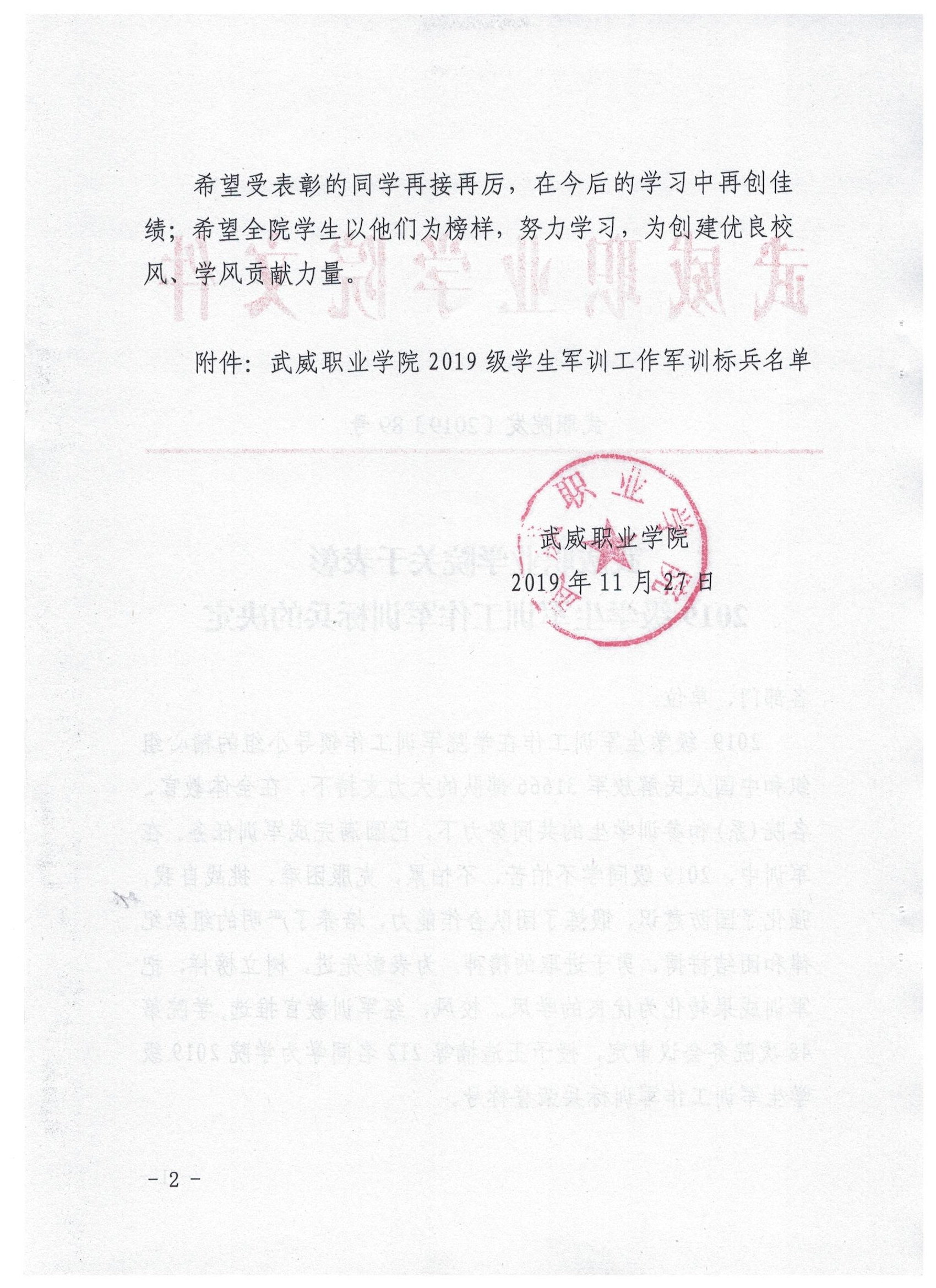 武威職業(yè)學院關于表彰2019級學生軍訓工作軍訓標兵的決定