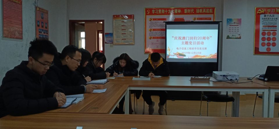 為深入學(xué)習(xí)領(lǐng)會習(xí)近平總書記在慶祝澳門回歸祖國20周年大會上的重要講話精神,12月23日下午,電子信息工程系學(xué)生黨支部組織開展“慶祝澳門回歸祖國20周年”主題黨日活動。