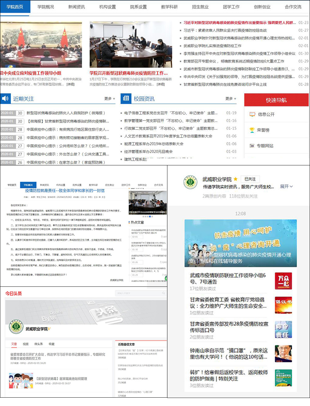 學(xué)院通過網(wǎng)站、微信公眾號、隴政釘、微信群、QQ群等平臺,第一時間刊載轉(zhuǎn)發(fā)習(xí)近平總書記重要指示、李克強(qiáng)總理批示,中共中央、教育部、省委、省教育工委、武威市委關(guān)于做好新型冠狀病毒感染肺炎疫情防控工作的重要會議、文件、通知以及《武威職業(yè)學(xué)院致全體同學(xué)和家長的一封信》《中共武威職業(yè)學(xué)院委員會致學(xué)院各基層黨組織和廣大共產(chǎn)黨員的倡議書》和防控知識50多條;做到宣傳教育和正面引導(dǎo)覆蓋到每一位教師、每一個班級、每一位學(xué)生,確保師生和學(xué)生家長及時了解疫情發(fā)展態(tài)勢、臨床癥狀和學(xué)習(xí)掌握防控知識;做到科學(xué)認(rèn)識、理性判斷、合理應(yīng)對,不信謠、不傳謠,養(yǎng)成健康的防控生活習(xí)慣,堅定信心、眾志成城防控疫情、戰(zhàn)勝疫情。