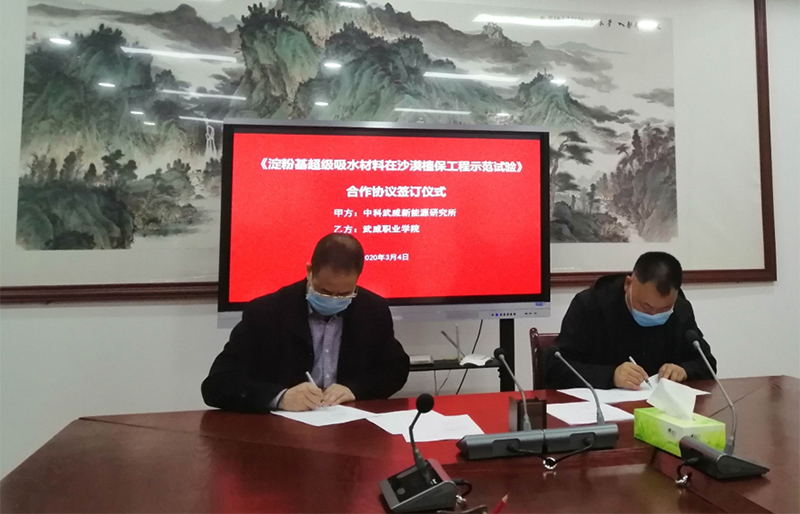 武威職業(yè)學(xué)院與中科武威新能源研究所舉行《淀粉基超級吸水材料在沙漠植保工程示范試驗》科研項目合作協(xié)議簽訂會議