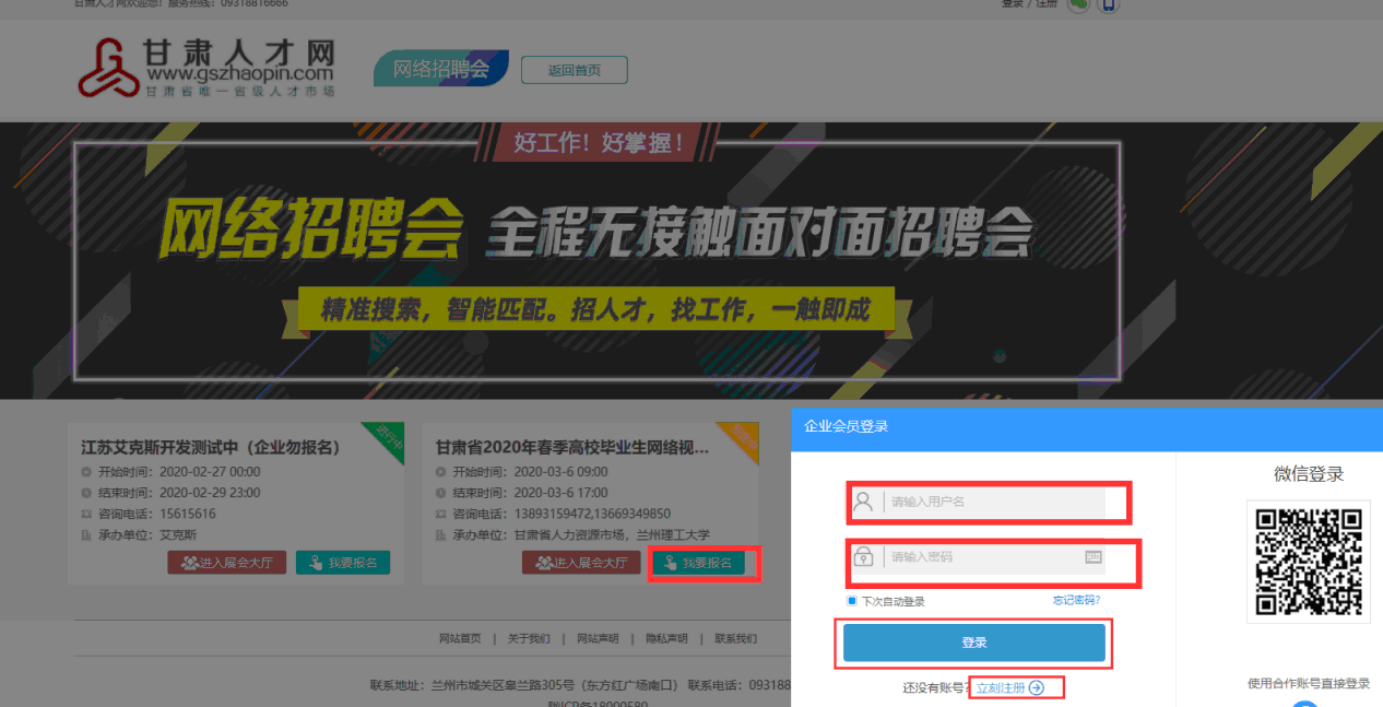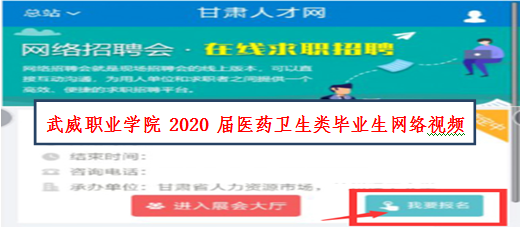 1.登錄甘肅人才網(wǎng)(www.gszhaopin.com),點(diǎn)擊菜單欄“招聘會(huì)”—“網(wǎng)絡(luò)招聘會(huì)”進(jìn)入二級頁面菜單,進(jìn)入網(wǎng)絡(luò)招聘會(huì)列表—選擇“武威職業(yè)學(xué)院2020屆醫(yī)藥衛(wèi)生類畢業(yè)生網(wǎng)絡(luò)視頻雙選會(huì)”點(diǎn)擊“我要報(bào)名”按鈕,登錄企業(yè)后臺(tái)(無賬號(hào)點(diǎn)擊“立即注冊”,資質(zhì)通過審核后再報(bào)名),待定審核。