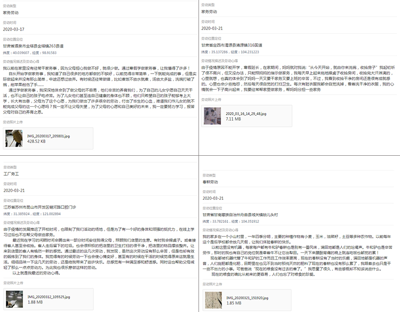 結(jié)合同學(xué)們生活和學(xué)習(xí)實(shí)際,學(xué)工處要求廣大同學(xué)積極參與志愿服務(wù)、春耕勞動(dòng)、工廠務(wù)工、家務(wù)勞動(dòng)等方面勞動(dòng)實(shí)踐,完成每周不少于2小時(shí)的實(shí)踐鍛煉,并通過(guò)信息化平臺(tái)上報(bào)活動(dòng)照片和勞動(dòng)心得。