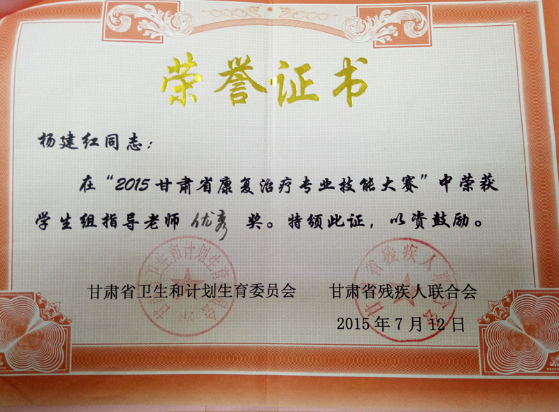 楊建紅榮獲“2015甘肅省康復治療專業(yè)技能大賽”學生組優(yōu)秀指導教師