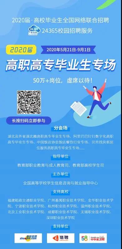 為了進一步促進2020屆高職高專畢業(yè)生就業(yè),教育部高校學(xué)生司和職業(yè)教育與成人教育司聯(lián)合推出“高職高專畢業(yè)生專場招聘會”,首批推出崗位超過50萬個。畢業(yè)生可登錄教育部大學(xué)生就業(yè)網(wǎng)(新職業(yè)網(wǎng)www.ncss.cn)或直接掃描宣傳頁中的二維碼參與活動。