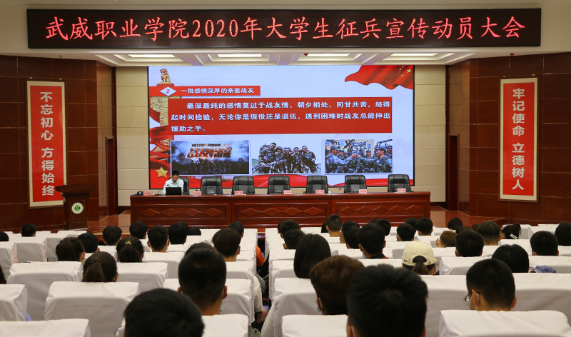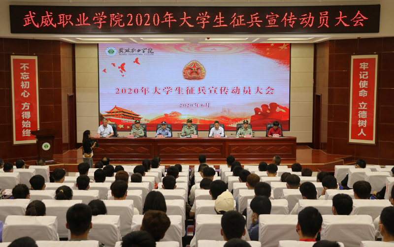 6月10日上午,學(xué)院2020年大學(xué)生征兵宣傳動(dòng)員大會(huì)在菁英廳舉行。武威軍分區(qū)司令員張國(guó)輝、武威軍分區(qū)動(dòng)員處處長(zhǎng)劉忠、涼州區(qū)人武部部長(zhǎng)闞延貴、涼州區(qū)人武部政委丁俊強(qiáng),學(xué)院黨委書(shū)記、院長(zhǎng)趙明,副院長(zhǎng)何毅出席會(huì)議。各院系負(fù)責(zé)人、輔導(dǎo)員和學(xué)生代表共200人參加了會(huì)議。會(huì)議由副院長(zhǎng)王守云主持。