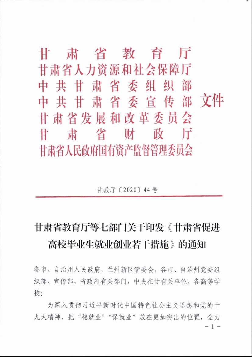 甘肅省教育廳等七部門關(guān)于印發(fā)《甘肅省促進(jìn)高校畢業(yè)生就業(yè)創(chuàng)業(yè)若干措施》的通知