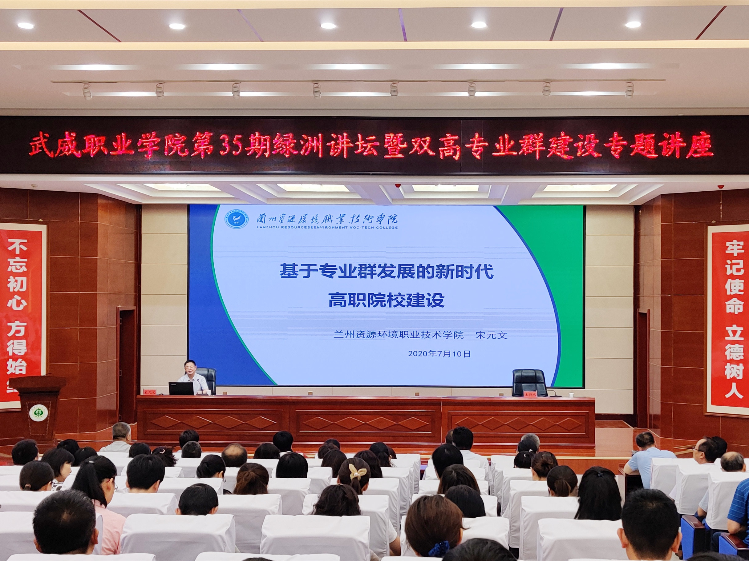 7月11日上午,學院在大學生活動中心菁英廳舉辦第35期綠洲講壇暨雙高專業(yè)群建設(shè)專題講座。學院黨委書記、院長趙明主持報告會,黨委副書記翟存祥,黨委委員、副院長田迎春、何毅、張開禮、王守云,武威職教集團成員單位代表,學院各部門和教學院系負責人、專業(yè)負責人和教師代表共計200余人參加了報告會。圖為蘭州資源環(huán)境職業(yè)技術(shù)學院黨委委員、副院長宋元文教授作“基于專業(yè)群發(fā)展的新時代高職院校建設(shè)”專題報告。