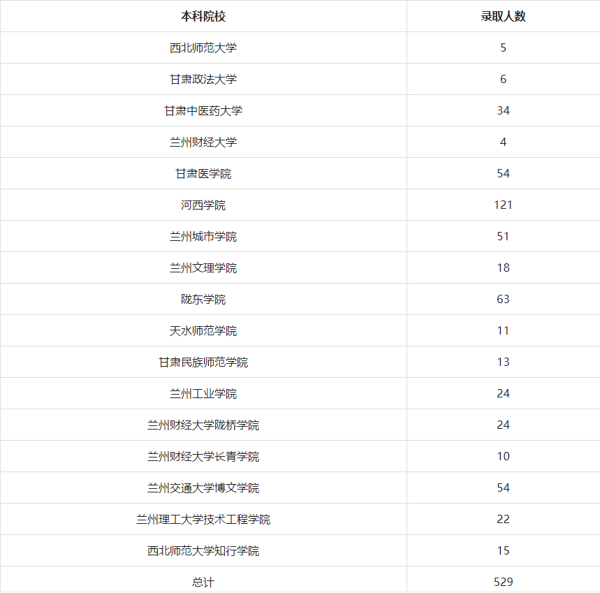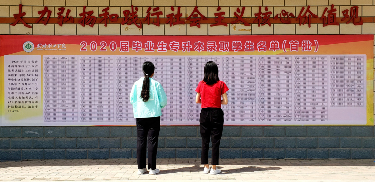 2020年甘肅省普通高等學(xué)校專升本第一批、第二批考試招生工作已圓滿結(jié)束。我院2020屆畢業(yè)生捷報頻傳,創(chuàng)下了歷年“專升本”升學(xué)的最好成績。726名學(xué)生報名參加考試,有529名學(xué)生被省內(nèi)本科院校錄取,錄取率為72.87%。