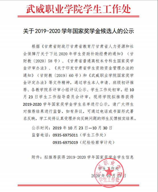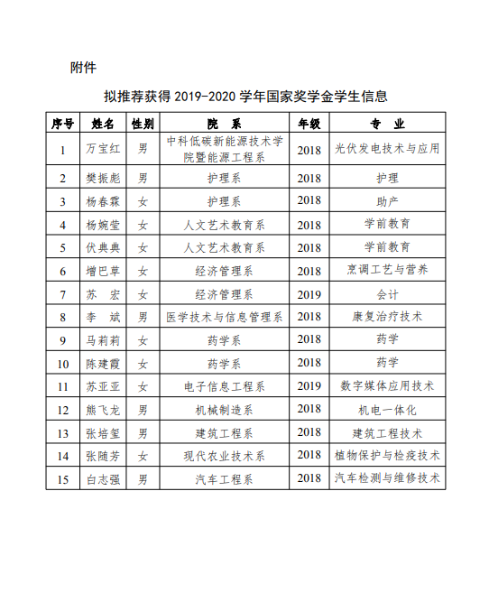 關(guān)于2019-2020學年國家獎學金候選人的公示