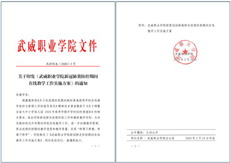 1月27日,學(xué)院新型冠狀病毒感染肺炎疫情聯(lián)防聯(lián)控工作領(lǐng)導(dǎo)小組召開會議,決定從1月28日開始停止學(xué)院一切線下教學(xué)活動,并組織擬訂學(xué)院在線教學(xué)工作方案。2月4日,學(xué)院初步制定完成《武威職業(yè)學(xué)院新型冠狀病毒肺炎疫情防控期間在線教學(xué)工作實施方案》并面向全院征求意見,同時要求各教學(xué)系積極謀劃、科學(xué)論證,制定各系在線教學(xué)工作實施方案。2月8日-14日,教務(wù)處陸續(xù)向各教學(xué)系推送教育部發(fā)布的各大教學(xué)平臺支持高校開展在線教學(xué)服務(wù)方案,并篩選中國大學(xué)MOOC、人衛(wèi)慕課、超星慕課、學(xué)銀在線等教學(xué)平臺推出的課程資源供各系參考使用,同時指導(dǎo)各系做好課程在線教學(xué)計劃編制工作。