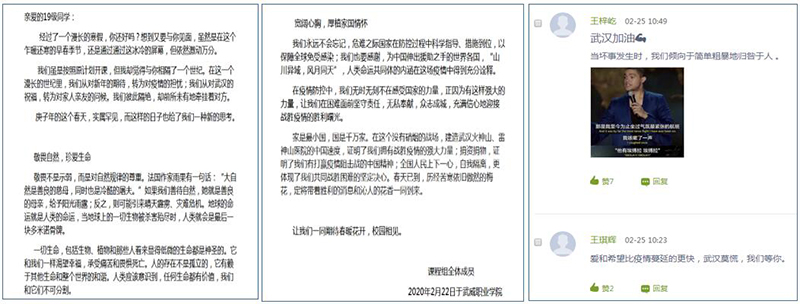 《中華優(yōu)秀傳統(tǒng)文化》課程團隊的馮文娟老師在開學(xué)第一天借助在線教學(xué)平臺向?qū)W生推送了《致2019級學(xué)生的一封信》,激勵學(xué)生要敬畏自然、珍愛生命,致敬英雄、感恩榜樣,寬闊心胸、厚植家國情懷。信中這樣寫道:“在疫情防控中,我們無時無刻不在感受國家的力量,正因為有這樣強大的力量,讓我們在困難面前堅守責(zé)任,無私奉獻,眾志成城,充滿信心地迎接戰(zhàn)勝疫情的勝利曙光?!薄?家是最小國,國是千萬家。在這個沒有硝煙的戰(zhàn)場,建造武漢火神山、雷神山醫(yī)院的中國速度,證明了我們擁有戰(zhàn)勝疫情的強大力量;捐資捐物,證明了我們有打贏疫情阻擊戰(zhàn)的中國精神;全國人民上下一心,自我隔離,更體現(xiàn)了我們共同戰(zhàn)勝困難的堅定決心。春天已到,歷經(jīng)苦寒依舊傲然的梅花,定將帶著勝利的消息和沁人的花香一同到來?!蓖瑫r,為學(xué)生推送由央視頻和有道精品課共同錄制的《面對疫情教你如何有效防范》疫情防控專題視頻,與學(xué)生一起為打贏新冠肺炎疫情防控阻擊戰(zhàn)貢獻力量。