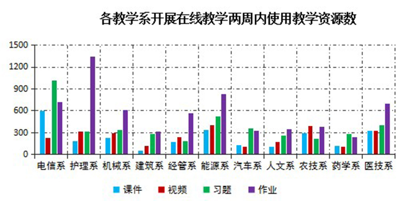 開展在線教學(xué)兩周以來,通過學(xué)院在線教學(xué)平臺管理后臺數(shù)據(jù)整理分析,教師為在線授課準(zhǔn)備了充足的教學(xué)資源。兩周內(nèi),學(xué)院教學(xué)平臺新上傳教學(xué)課件2527個,教學(xué)視頻2701個;新設(shè)置課堂練習(xí)題4176道,發(fā)布課后作業(yè)題6375道,豐富的資源有力支持在線教學(xué)順利進行。