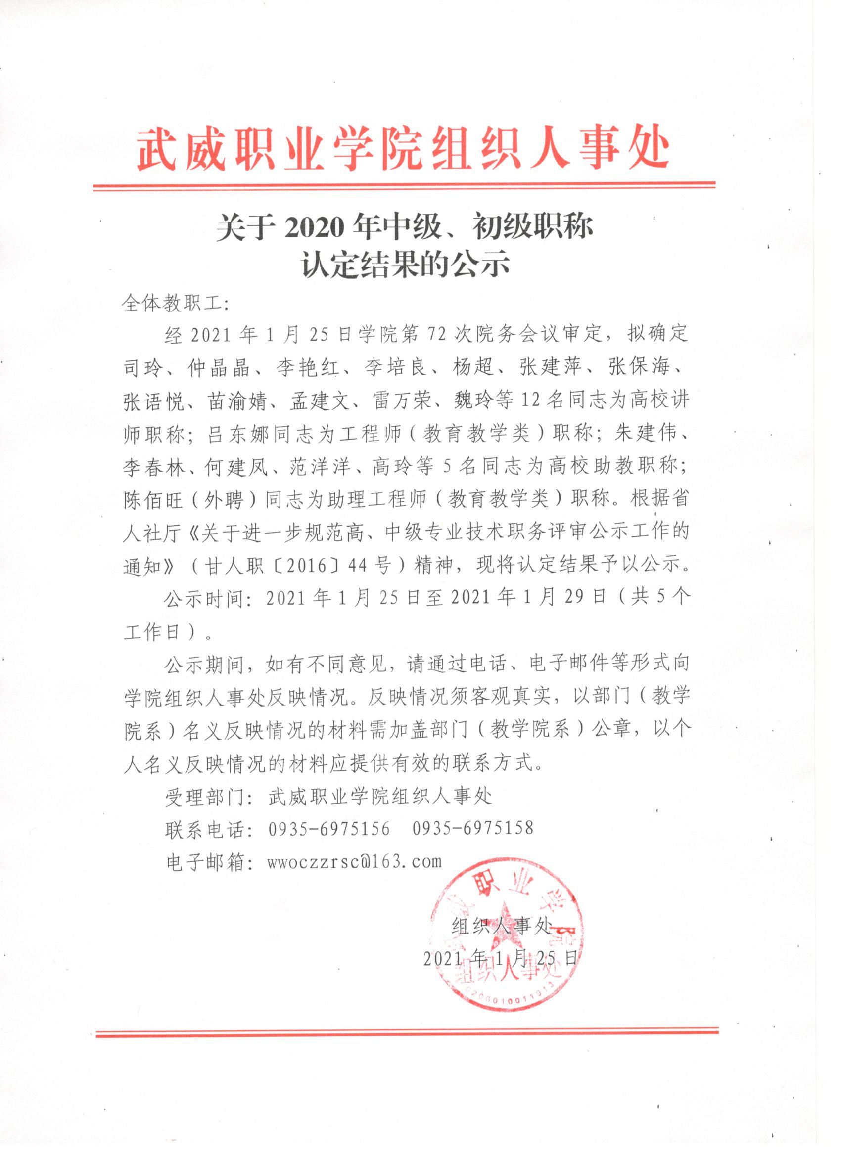 關(guān)于2020年中級(jí)、初級(jí)職稱認(rèn)定結(jié)果的公示