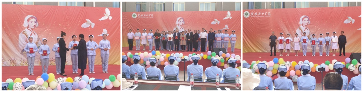 頒獎(jiǎng)儀式激勵(lì)同學(xué)們銳意進(jìn)取。伴隨著白衣天使之歌的音樂(lè),學(xué)院領(lǐng)導(dǎo)向2021年甘肅省護(hù)理技能大賽獲獎(jiǎng)選手及學(xué)院第七屆護(hù)理技能大賽獲獎(jiǎng)的團(tuán)體和個(gè)人表示熱烈的祝賀,同時(shí)頒發(fā)獎(jiǎng)狀和榮譽(yù)證書并合影留念。