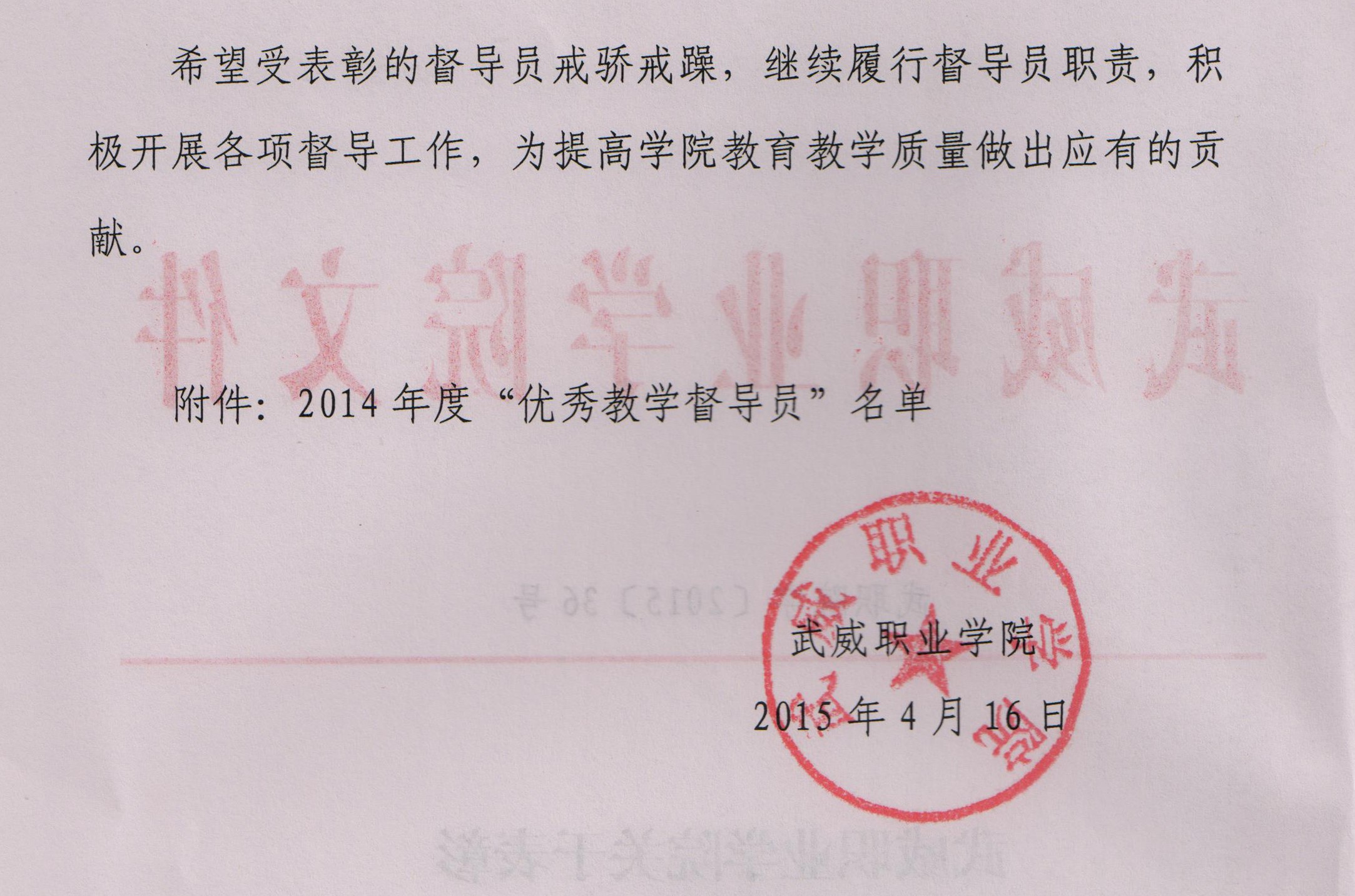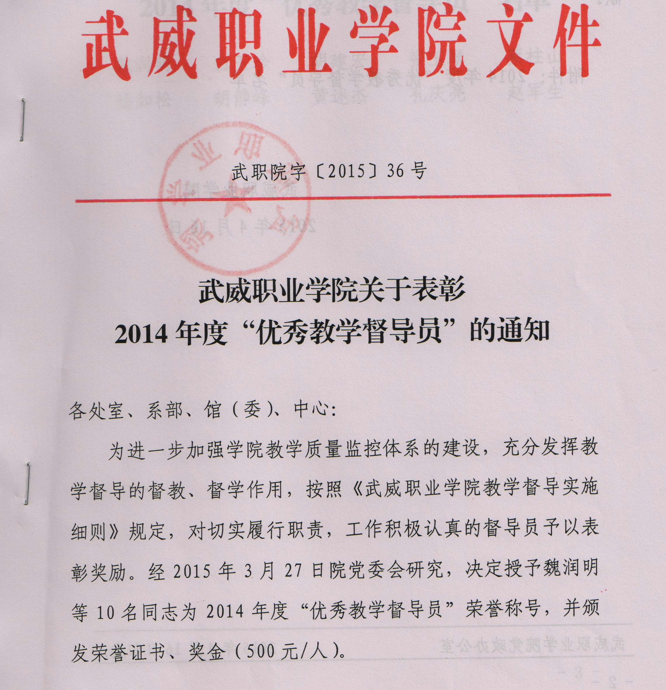 關于表彰2014年度“優(yōu)秀教學督導員”的決定