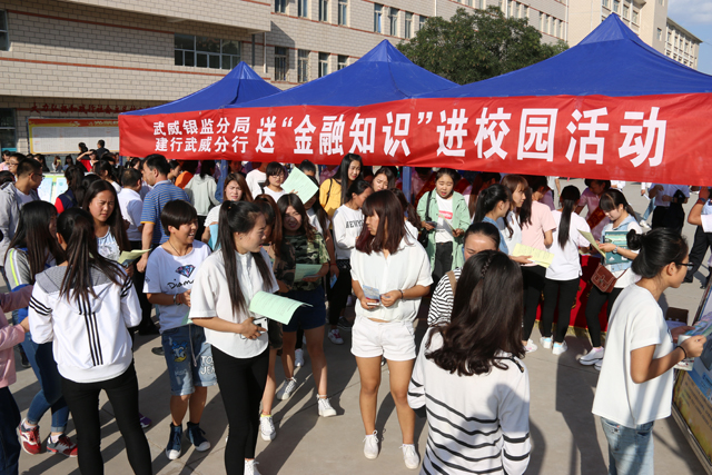 為幫助和引導(dǎo)大學(xué)生群體牢固樹立金融安全意識,9月13日下午,武威銀監(jiān)分局聯(lián)合建行武威分行在武威職業(yè)學(xué)院尚德樓南操場開展了“送金融知識進(jìn)校園”宣傳活動。