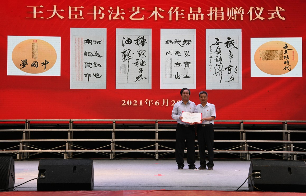 之后舉行了王大臣先生書(shū)法藝術(shù)作品捐贈(zèng)儀式,學(xué)院黨委書(shū)記、院長(zhǎng)趙明教授為王大臣先生頒發(fā)《收藏證書(shū)》。王大臣先生自愿將140多件書(shū)法藝術(shù)作品無(wú)償捐贈(zèng)給我們學(xué)院,給我們留下了寶貴的精神財(cái)富,讓作品中蘊(yùn)含的紅色基因薪火相傳、血脈永續(xù)!