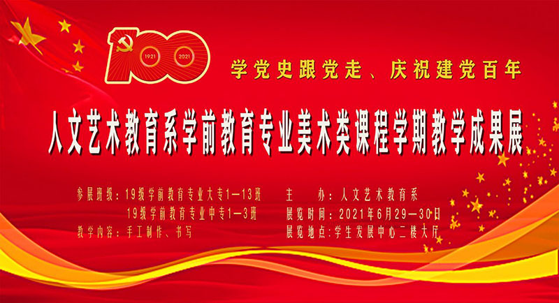 6月29日—30日人文藝術(shù)教育系在大學生發(fā)展中心二樓菁英廳大廳舉辦“學黨史跟黨走”、“慶祝建黨百年”為主題的學前教育專業(yè)美術(shù)類課程學期教學成果展。