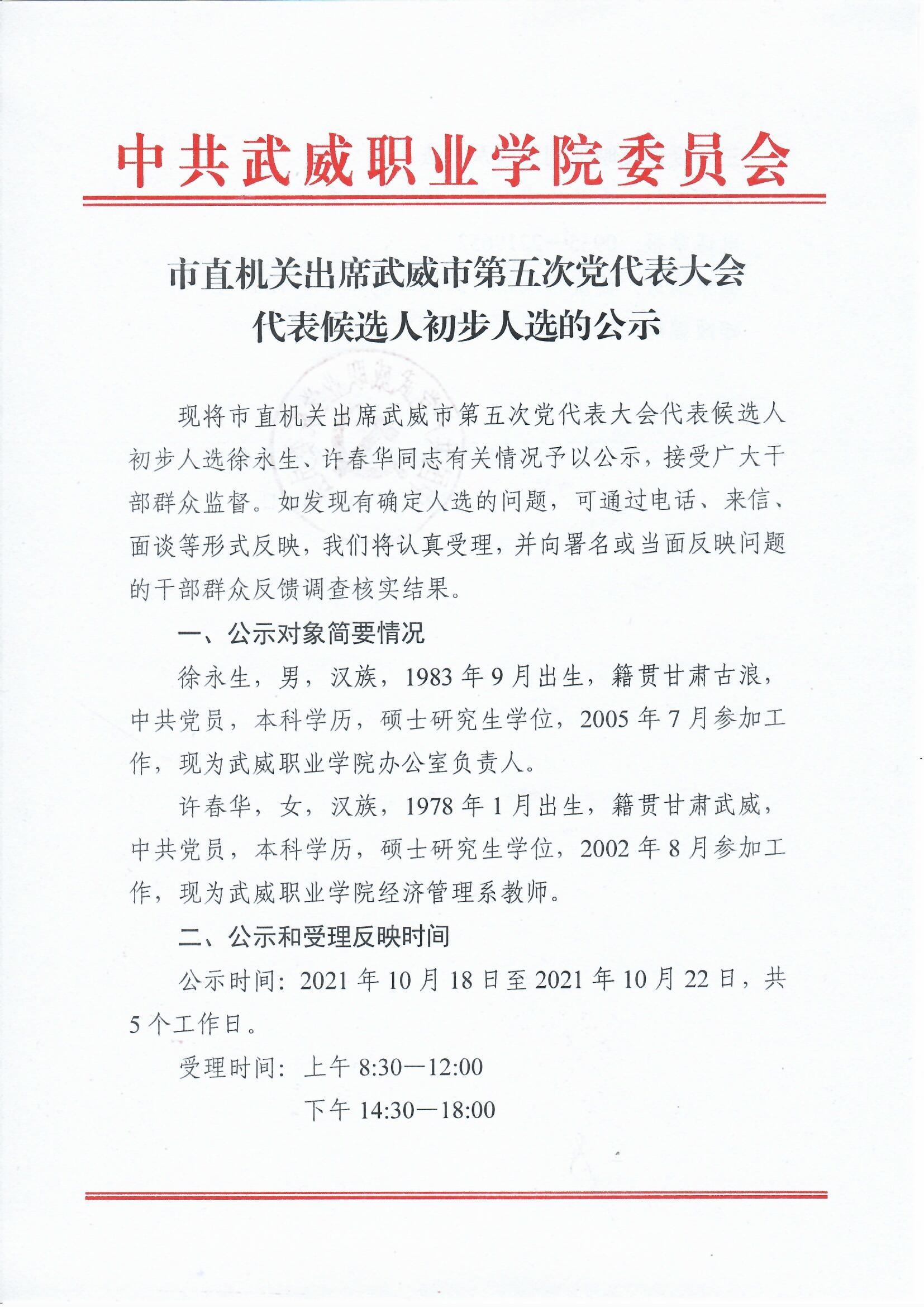 市直機關(guān)出席武威市第五次黨代表大會代表候選人初步人選的公示