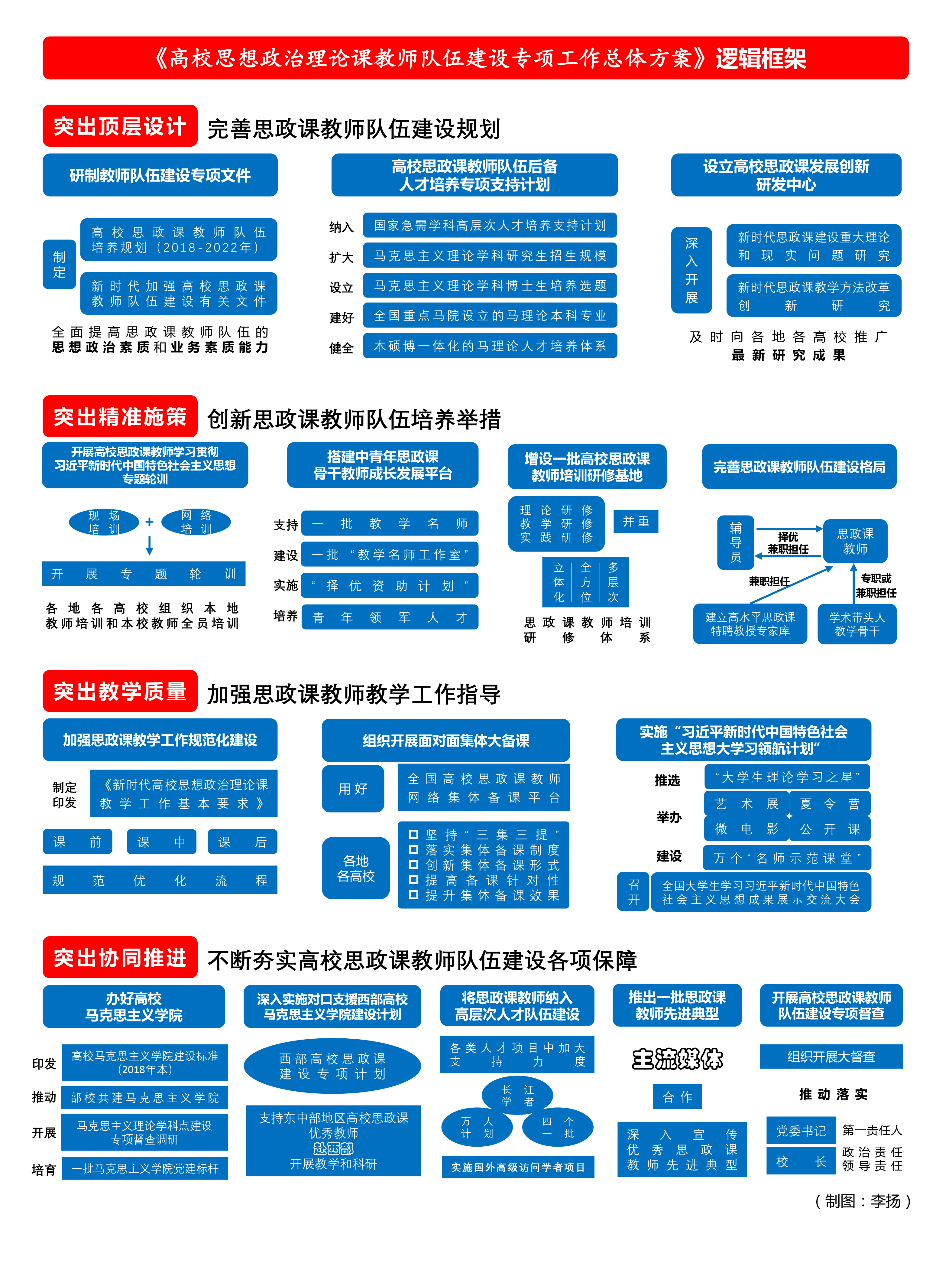 為全面推動習(xí)近平新時(shí)代中國特色社會主義思想進(jìn)教材進(jìn)課堂進(jìn)學(xué)生頭腦,聚焦提升思政課教師綜合素質(zhì)和專業(yè)化水平,繼續(xù)打好提高高校思政課質(zhì)量和水平的攻堅(jiān)戰(zhàn),培養(yǎng)擔(dān)當(dāng)民族復(fù)興大任的時(shí)代新人,教育部決定2018年實(shí)施高校思想政治理論課教師隊(duì)伍建設(shè)專項(xiàng)工作,并于日前印發(fā)了工作總體方案。