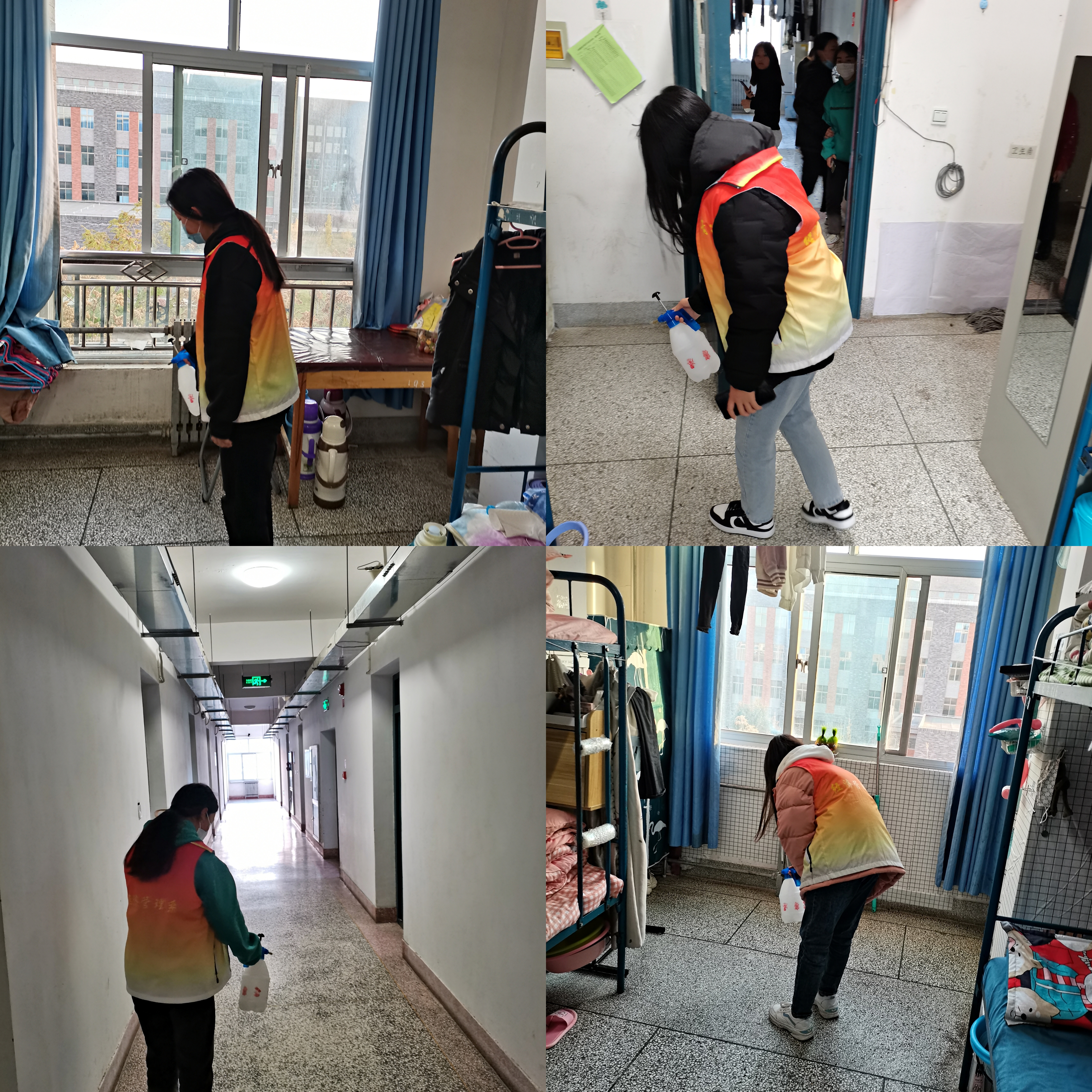 為切實抓好宿舍及公共區(qū)域防控消殺工作,營造安全舒適的學習生活環(huán)境,志愿者協(xié)會根據(jù)不同職能劃分為7個小組,按照“一天兩次”消殺頻率持續(xù)對經(jīng)緯樓、3號學生公寓等宿舍樓內(nèi)的學生宿舍進行通風消毒工作,重點對宿舍地面、床底、門角處等位置進行全方位、多角度消毒,盡量做到消殺不留死角。同時,志愿者還通過網(wǎng)絡(luò)平臺學習疫情防控措施相關(guān)知識,并在消殺過程中為同學們普及疫情防控知識,全面加強宣傳引導(dǎo),幫助廣大師生在第一時間了解防疫資訊,有效杜絕謠言傳播,確保廣大師生情緒穩(wěn)定。