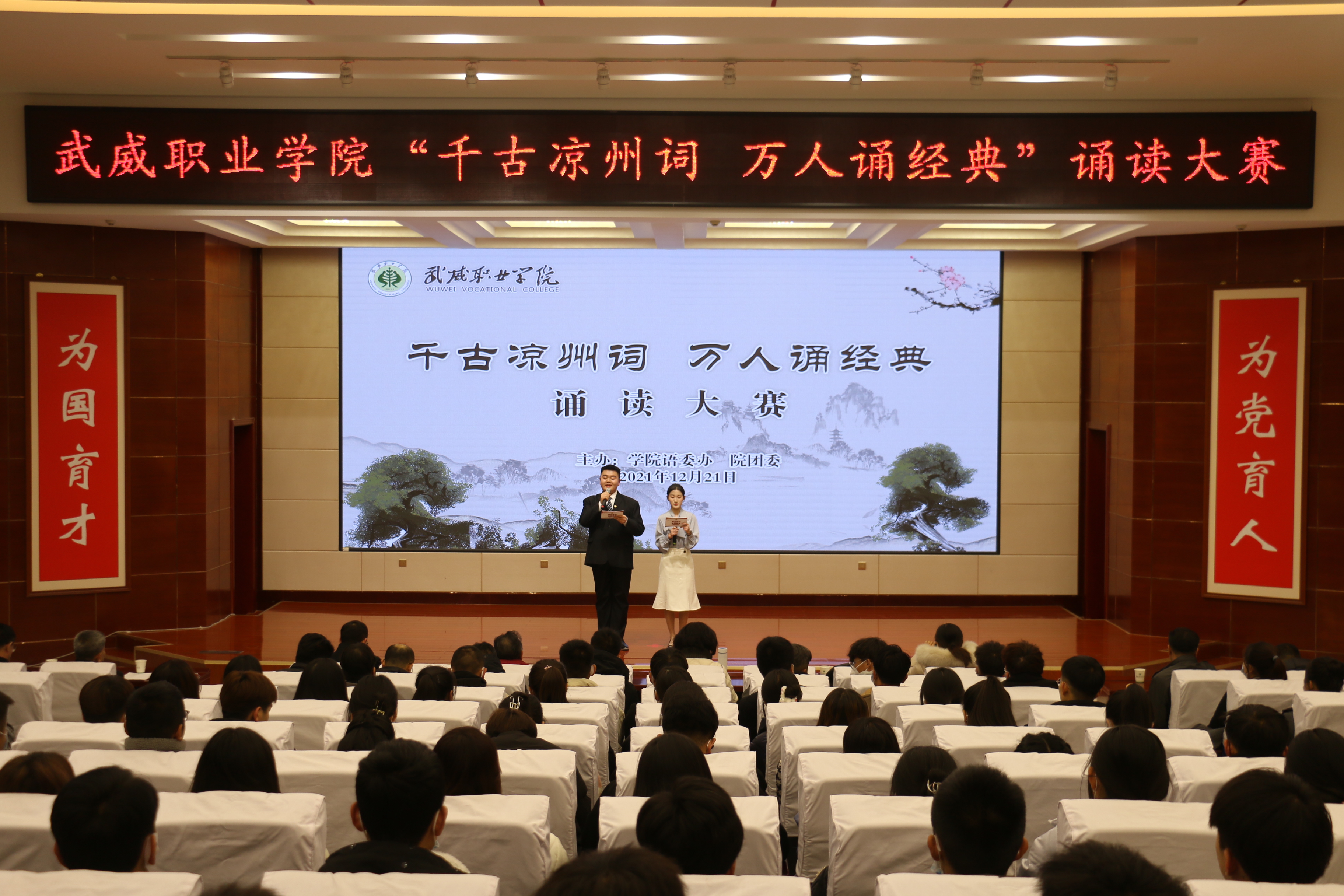 為深化黨史學(xué)習(xí)教育,推進(jìn)“雙高計劃”建設(shè)任務(wù),弘揚(yáng)涼州文化,傳承絲路精神,助推全國文明城市創(chuàng)建,營造書香校園氛圍,12月21日晚,學(xué)院“千古涼州詞 萬人誦經(jīng)典”誦讀大賽在菁英廳舉辦,學(xué)院黨委書記、院長趙明,黨委委員、副院長張開禮,黨委委員、副院長王守云出席活動,各分團(tuán)委書記及學(xué)生代表250余人觀看比賽。