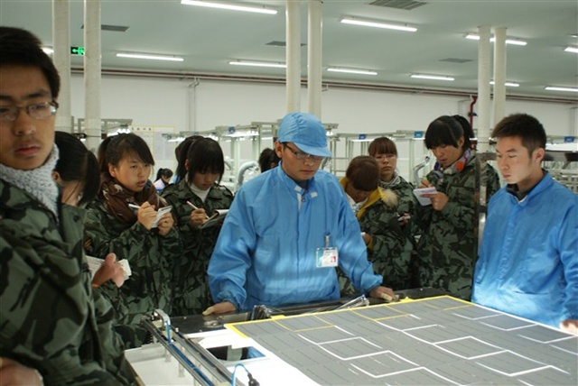 在校外實訓過程中,由工藝部楊經(jīng)理和工藝部文工程師給大家介紹公司情況、公司管理規(guī)范,并帶領(lǐng)大家進行參觀,給學生詳細講解整個光伏產(chǎn)業(yè)鏈,包括硅片的生產(chǎn)、電池片的生產(chǎn)和太陽能電池組件的生產(chǎn),重點是光伏組件的生產(chǎn)。實訓期間由工廠師傅帶領(lǐng)學生在車間分組進行實訓。依據(jù)光伏組件生產(chǎn)工作流程實訓內(nèi)容分為前道工序和后道工序,前道工序包括:電池片篩選、單焊、串焊、疊層、初檢、EL1測試和層壓;后道工序包括:削邊、裝邊框、裝接線盒、清洗、EL2測試、功率測試、終檢和包裝入庫。同學們通過親身體驗和輪崗學習,熟悉了光伏組件的每一道生產(chǎn)工序,對光伏組件的整個生產(chǎn)過程有了一個更加清晰的認識和了解。