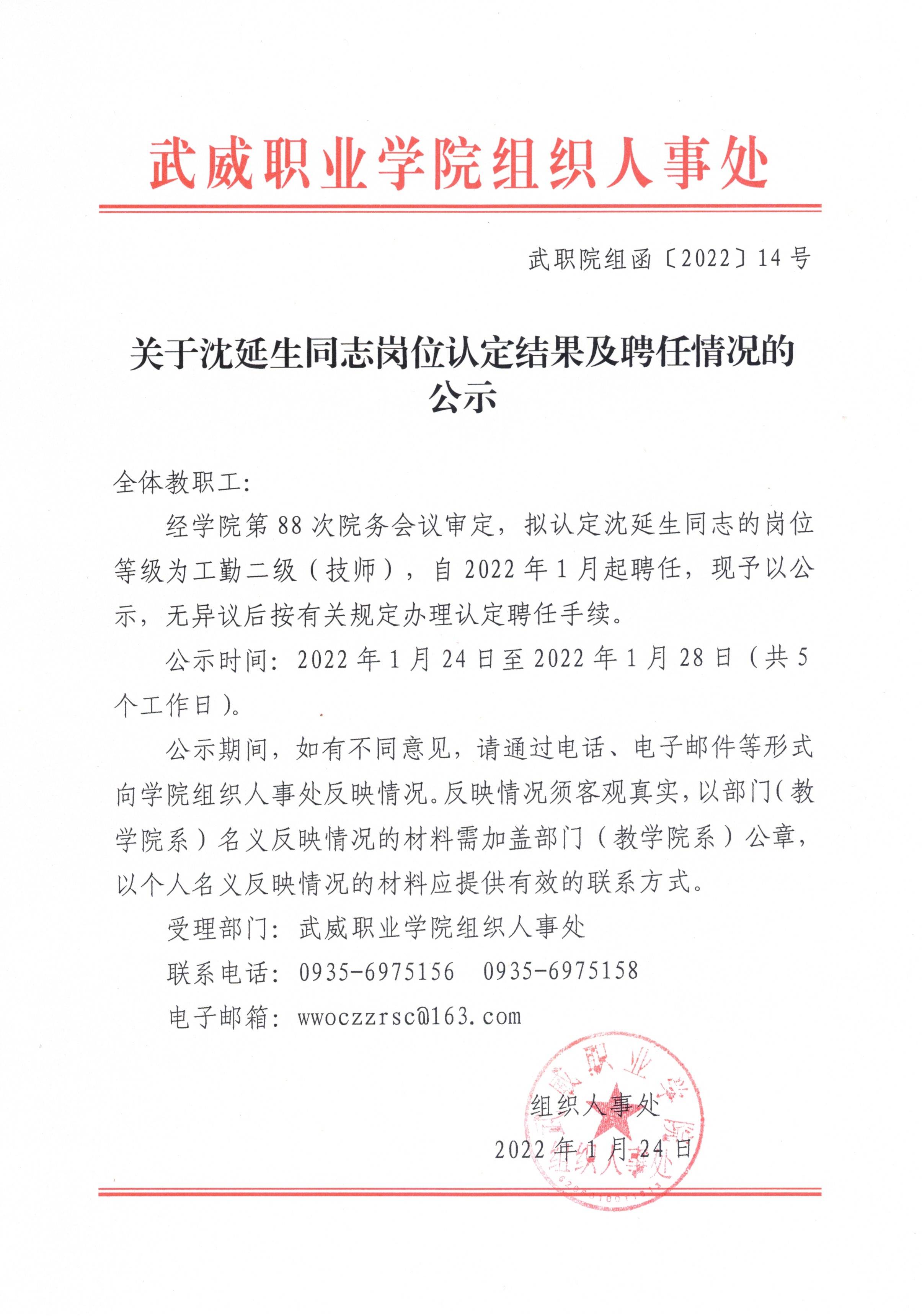關(guān)于沈延生同志崗位認定結(jié)果及聘任情況的公示