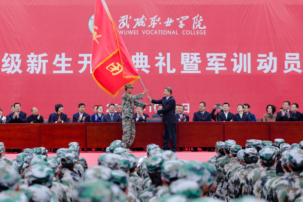 最后,趙明代表學院向軍訓團授旗,并宣布2021年新生軍訓開始。